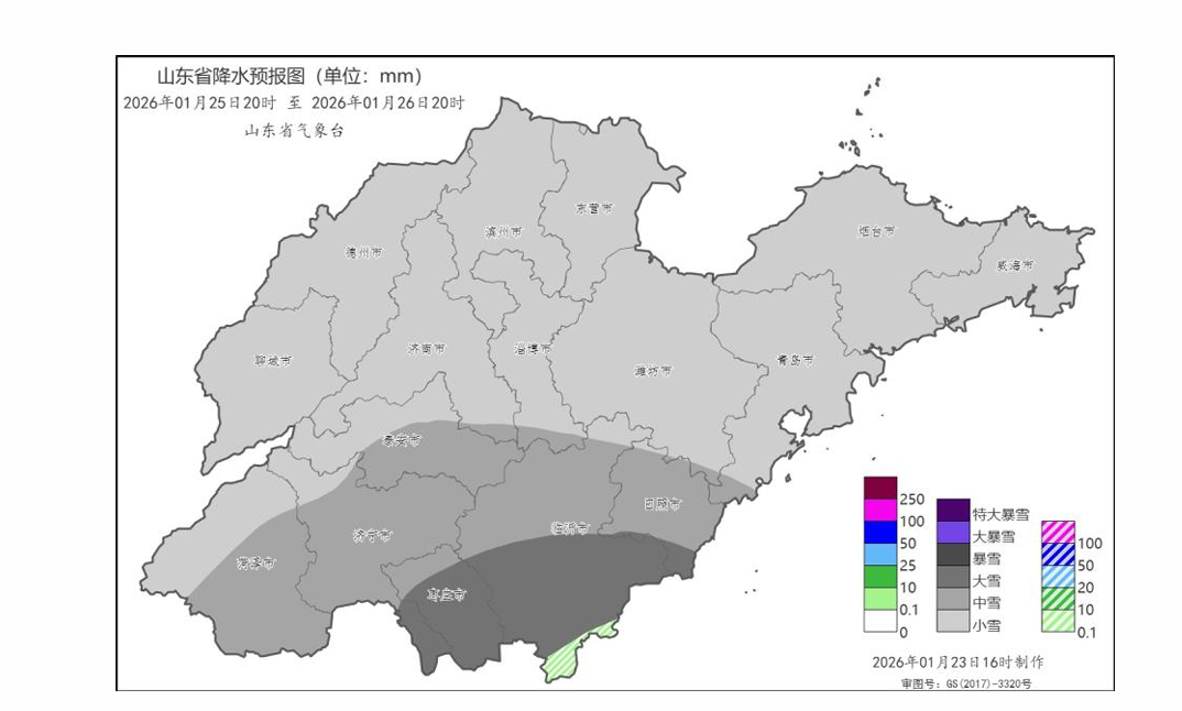 1月23日,记者从山东省气象台了解到,受冷空气和暖湿气流共同影响,预计25日夜间到26日白天,我省自西向东将有一次较明显雨雪天气过程,全省累积平均降水量1~3毫米。其中,菏泽、济宁、枣庄、临沂、日照和泰安有雨夹雪转小到中雪局部大雪(2~6毫米),聊城、德州、济南、淄博、潍坊和青岛有小雪局部中雪(0.1~3毫米),滨州、东营、烟台和威海局部有小雪(0~1毫米)。