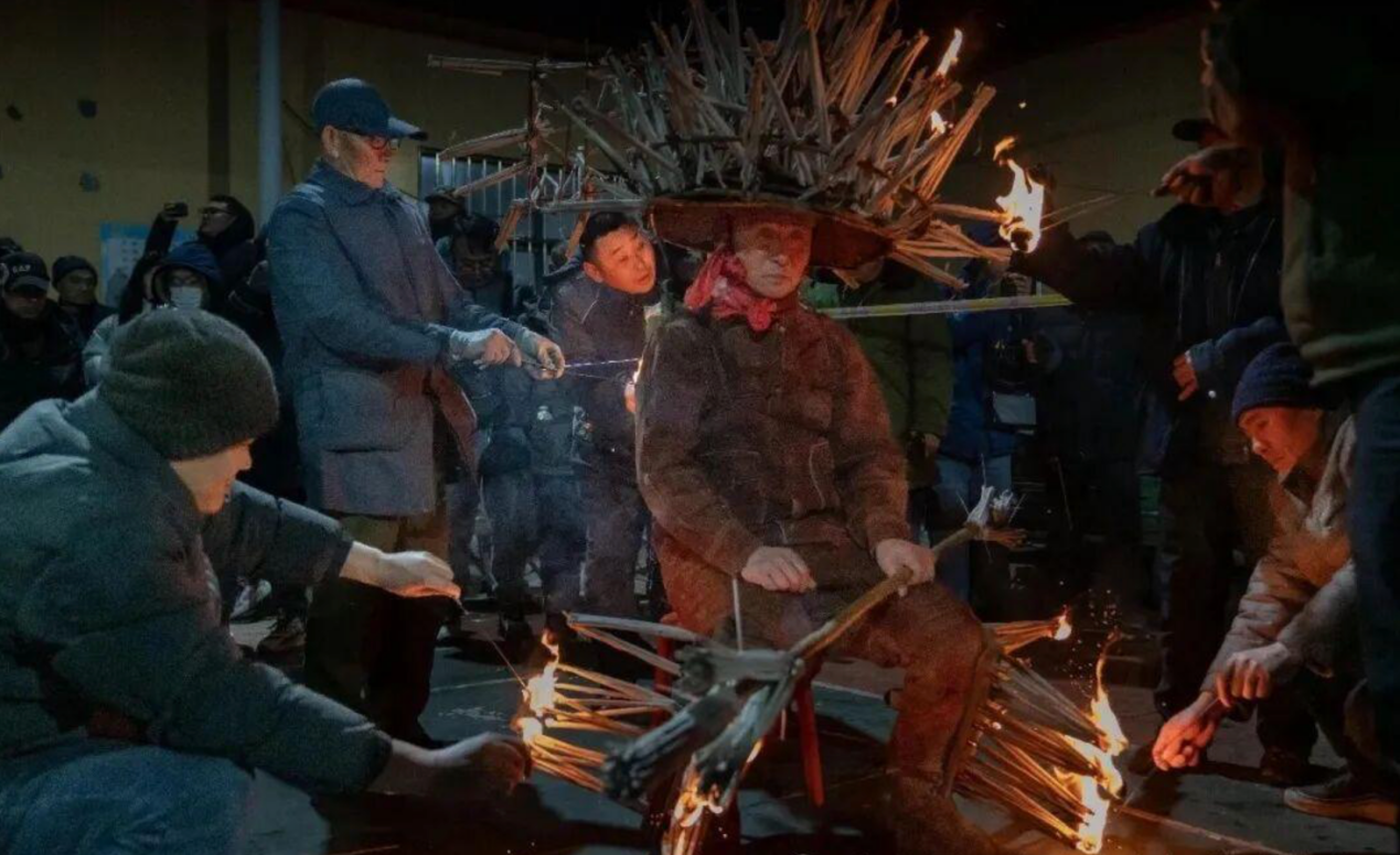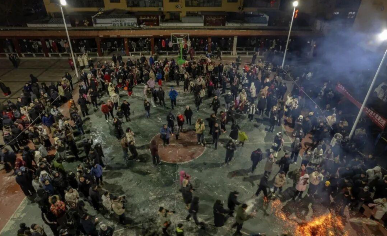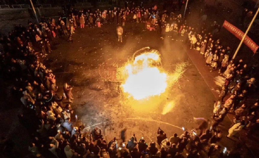 当晚的平阳寺村灯火通明,锣鼓声穿透寒意,村民与游客早已围聚成圈,静待这场“火与舞”的盛宴。作为山东省第二批非物质文化遗产,平阳寺火虎已有120余年历史,由当地周家先人融合舞狮表演与礼花筋技艺独创而成,以五代时期李存孝打虎的历史故事为背景,演绎出热烈奔放、勇猛豪迈的民俗风情。