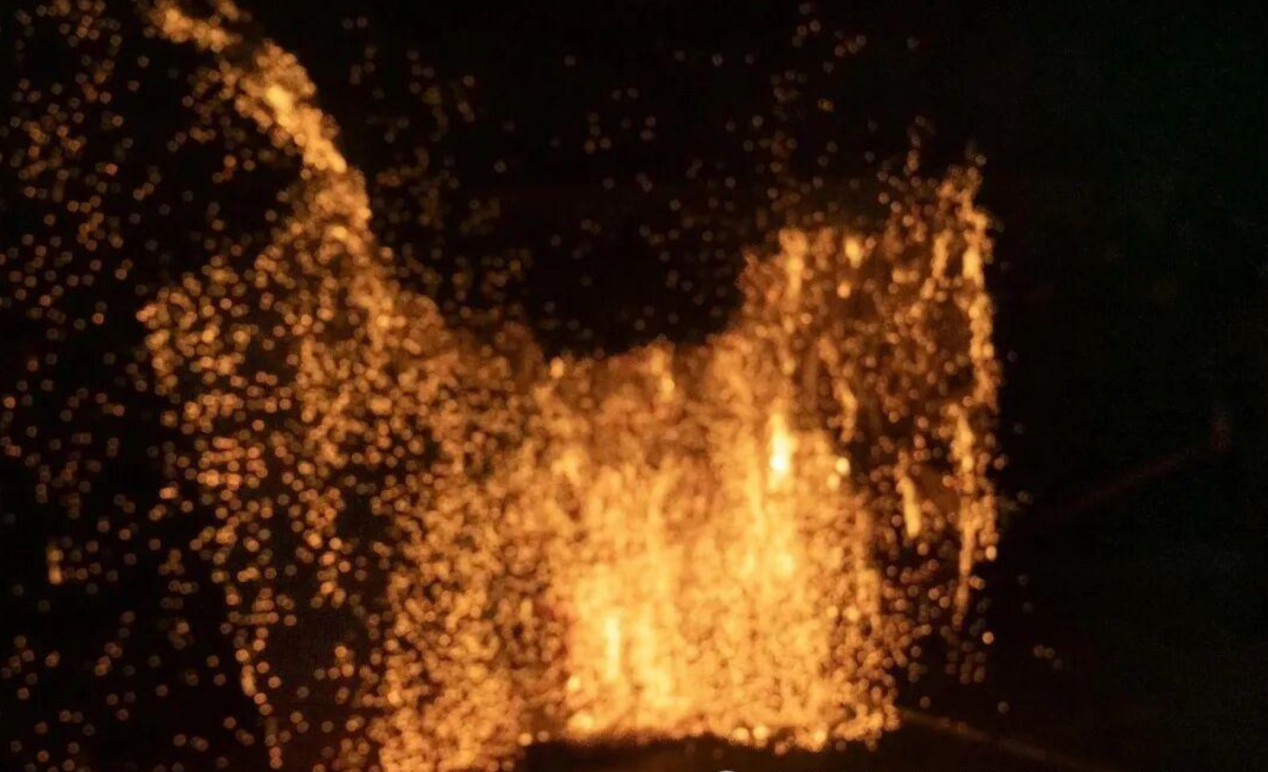 随着夜幕渐深,表演正式启幕。顶虎人身披重达25公斤的虎衣,衣身由千余块木板拼接而成,插满两千多根礼花筋,点燃后周身金花四溅、双眼如炬;打虎人身着木制衣甲,手持燃火打虎棒,与“火虎”在锣鼓声中展开激烈缠斗。腾挪跳跃间,火花如流星洒落,水雾遇火绽放出绚烂光影,6名灭火助手手持水壶随时防护,构成一幅惊险与壮美交织的民俗画卷。这场仅持续十多分钟的表演,每一个瞬间都充满视觉张力,让现场观众屏息凝神、赞叹不已。