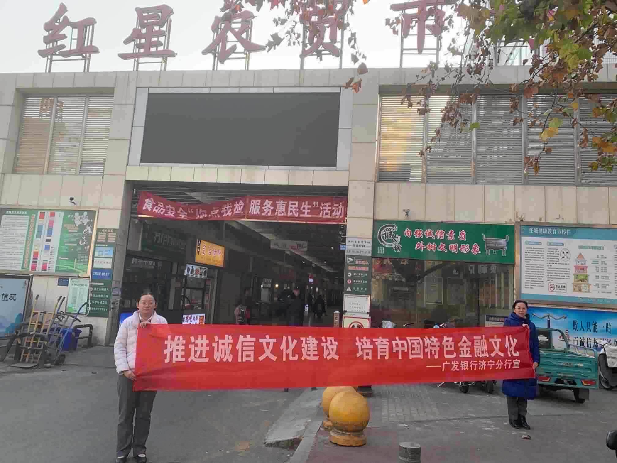 为深入推进诚信文化建设,培育中国特色金融文化,12月1日,广发银行济宁分行营业部组织工作人员走进红星农贸市场,开展以“诚实守信、金融为民”为核心的金融文化宣传活动。