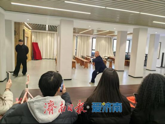 活动中,历下区省级非遗项目“济南八极拳”的展示将气氛推向高潮。济南八极拳动作刚劲、发力爆裂,讲究“动如绷弓,发若炸雷”,在济南已有近百年的传承历史。传承人彭飞、姚德彪老师现场展示了“铁山靠”“顶心肘”等经典动作,其短促有力的节奏与振奋的精神面貌,引来阵阵掌声。来自法国的武术爱好者皮埃尔观看后感慨:“中国武术不仅是技击,更是一种精神修炼,八极拳的力量感让我感受到中国人迎接新年时的朝气与自信。”