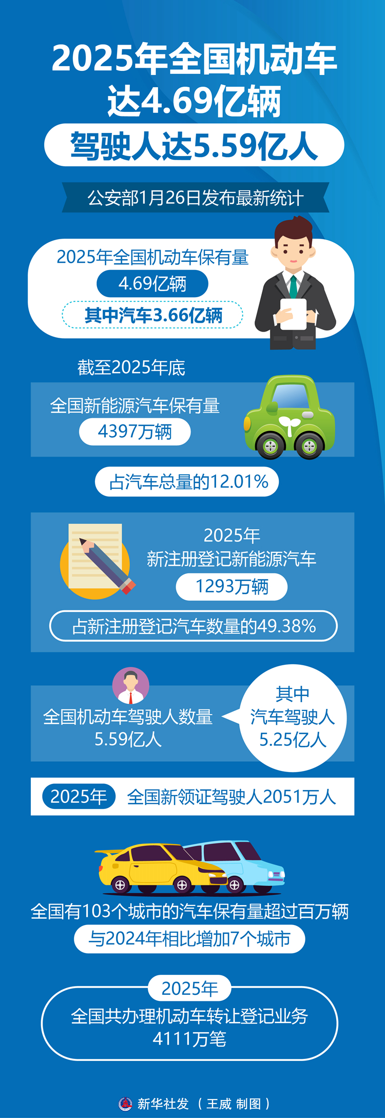 新华社北京1月26日电 公安部26日发布最新统计,2025年全国机动车保有量达4.69亿辆,其中汽车3.66亿辆;机动车驾驶人达5.59亿人,其中汽车驾驶人5.25亿人。2025年全国新注册登记机动车3535万辆,已连续11年超过3000万辆。