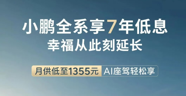 小鹏汽车全系车型同样推出7年低息政策,月供低至1355元,以MONA M03 515长续航Plus车型为例,15%首付、年费率1.67%,实现长期低负担用车。