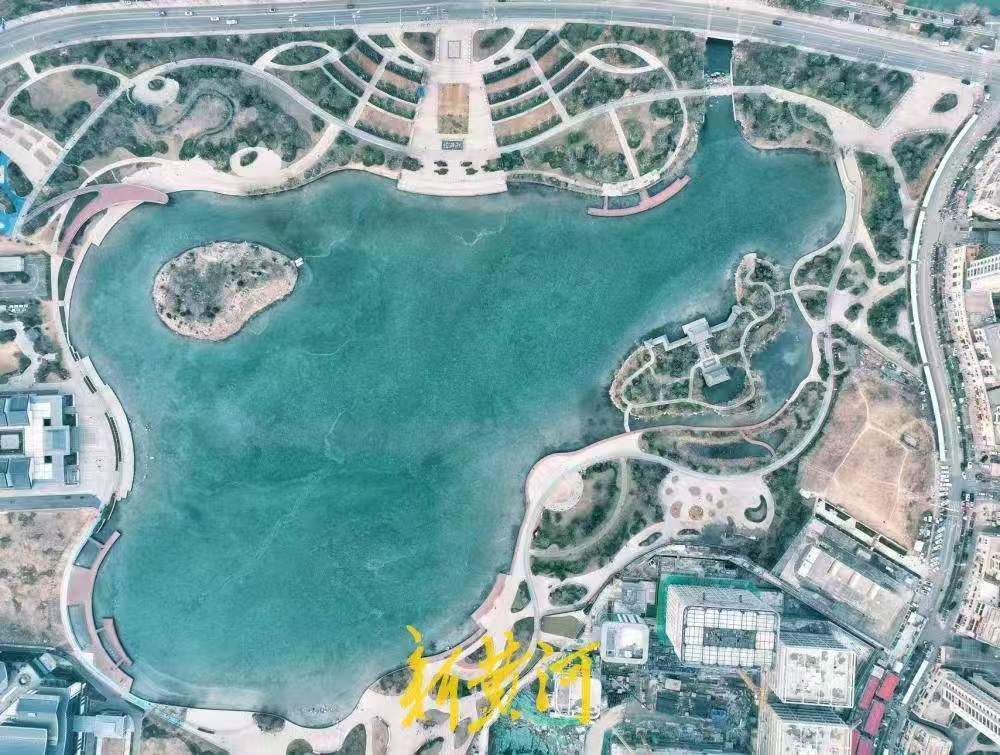 1月26日,云锦湖全部结冰,空中俯瞰被冰封的湖泊如同一块巨型翡翠,美轮美奂,璀璨迷人,来此越冬的近百只白骨顶鸡聚集在冰面上行走嬉戏,为冬日的云锦湖增添了生机。(来源:新黄河 记者:王汗冰 )