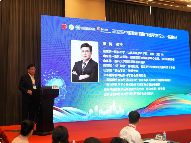山东第一医科大学(山东省医学科学院)辛涛教授发表致辞。他表示,作为本次论坛的承办地,山东省神经外科同仁深感荣幸能与全国顶尖专家共聚泉城,深入交流。中国胶质瘤协作组长期引领领域发展方向,其倡导的多学科协作与精准治疗理念,已深刻改变了临床实践面貌。本次会议聚焦前沿技术转化与临床实战难题,议题设置兼具高度与深度,必将为与会者带来宝贵启发。他期待以本次论坛为契机,进一步强化区域与全国学术网络的联动,共同推动胶质瘤诊疗的规范化与个体化进程,最终让更多患者受益。