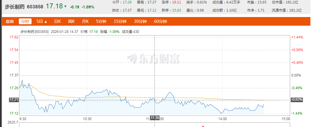 业绩利好消息并未提振其股价。1月28日,步长制药股价开盘即下跌,至上午收盘报收17.21元/股,下跌0.92%。