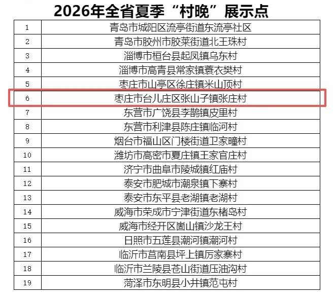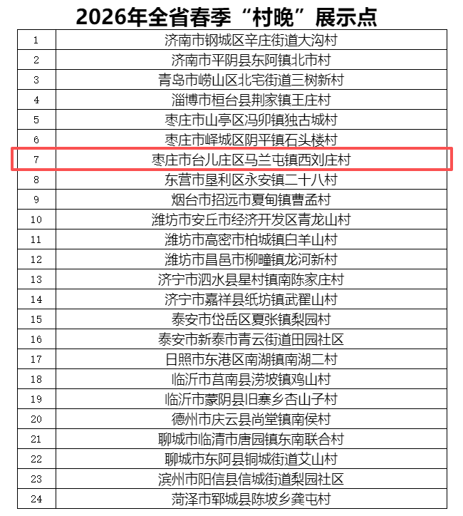 近日,山东省文化和旅游厅发布2026年全省“四季村晚”展示点公示名单,枣庄市共有8个村入选,其中台儿庄区共有4个村成功上榜!