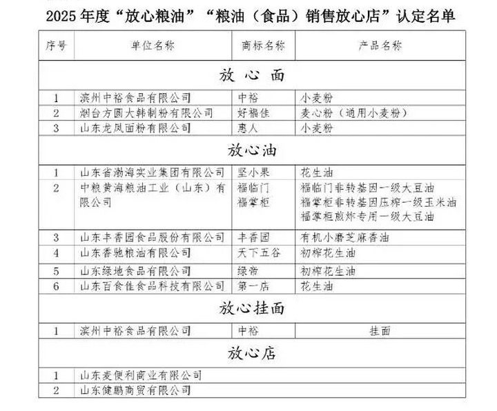 为高质量发展粮食产业,深入实施优质粮食工程,做好中国好粮油和齐鲁粮油的基础性工作,让百姓用上放心粮油食品,该协会进行了2025年度“放心粮油”“粮油(食品)销售放心店”的认定工作,按照《“放心粮油”“粮油(食品)销售放心店”认定监管办法》要求,经企业自愿申报和各市粮食行业协会审核推荐,并经协会组织专家评审,现将“放心粮油”“粮油(食品)销售放心店”名单公示,接受业内外监督。公示期从2026年1月26日起5个工作日止(节假日顺延),联系电话:0531-86403100。