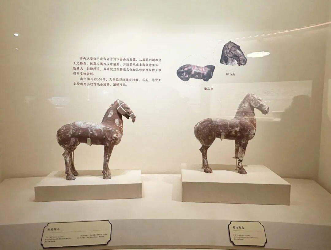 青州博物馆馆藏的4件香山汉墓陪葬坑出土彩绘陶马在本次展览中展出。这些陶马俑彩绘鲜艳,用色考究,绘画工艺精湛,为研究汉代马具、制陶工艺和彩绘工艺提供了珍贵的实物资料。陶马身上的彩绘图案也让我们清晰地看到中国汉代马鞯的原貌,具有珍贵的历史价值。