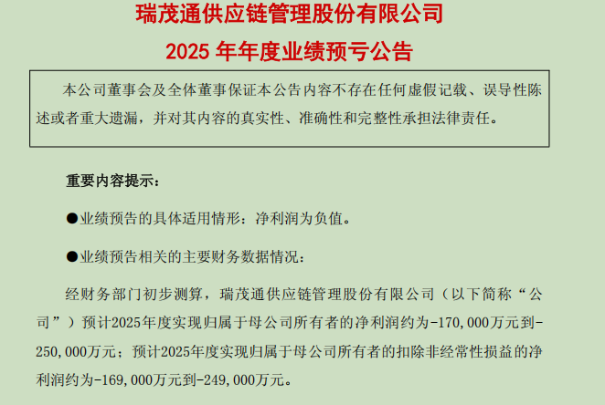1月30日,瑞茂通供应链管理股份有限公司(证券代码:600180 证券简称:瑞茂通)发布2025 年年度业绩预亏公告。
