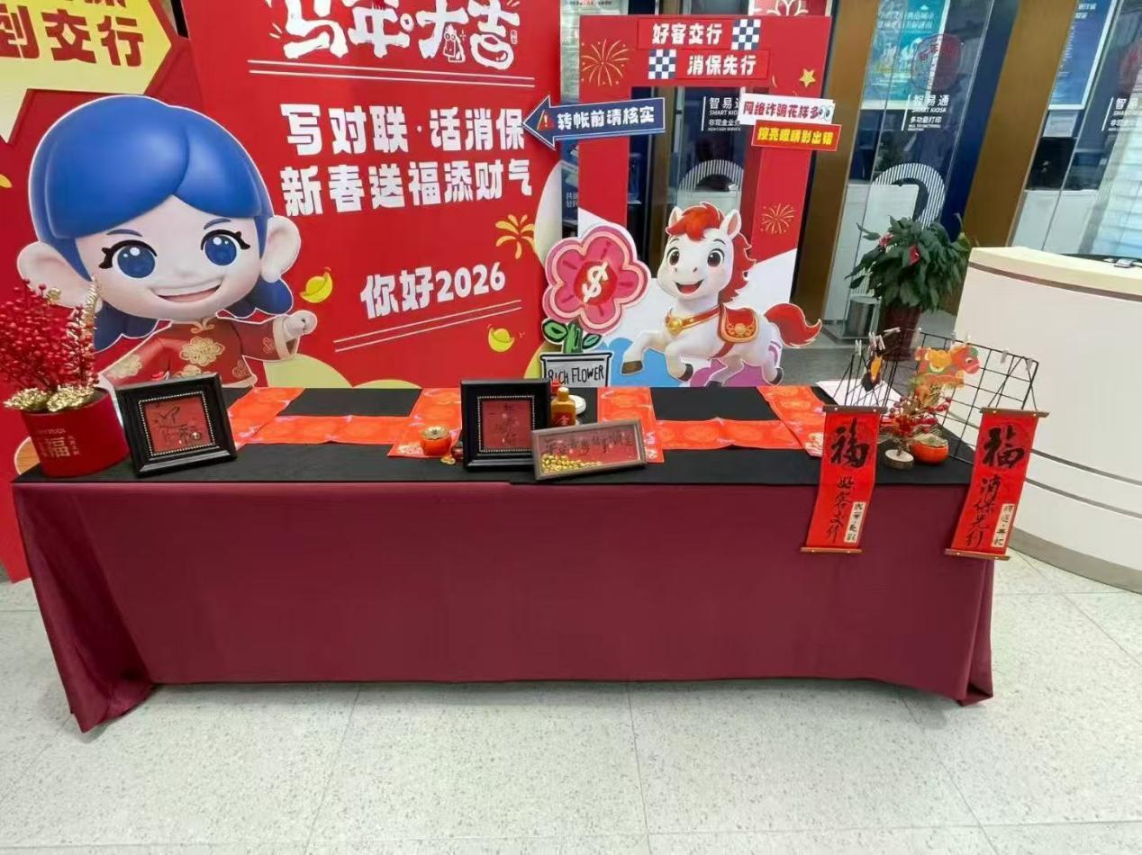 活动期间,各参与网点变身为“消保课堂”,巧妙融合消费者权益保护元素与新春佳节氛围,精心布置了主题鲜明、年味十足的金融教育场景。网点现场开设“金融知识小课堂”,向市民普及反诈防骗、理性投资等实用知识。参与互动问答的市民,还可获得由现场书法名家挥毫书写的定制春联,在墨香年味中提升金融安全意识。