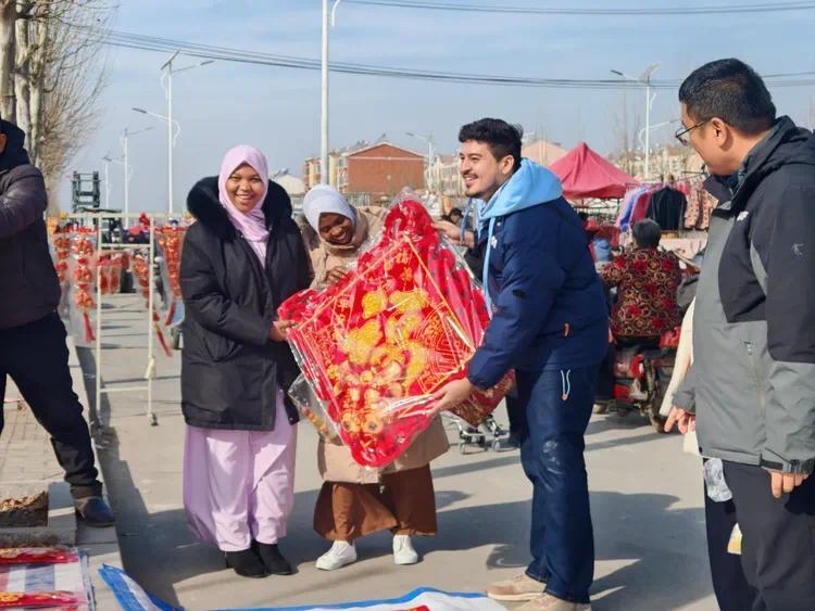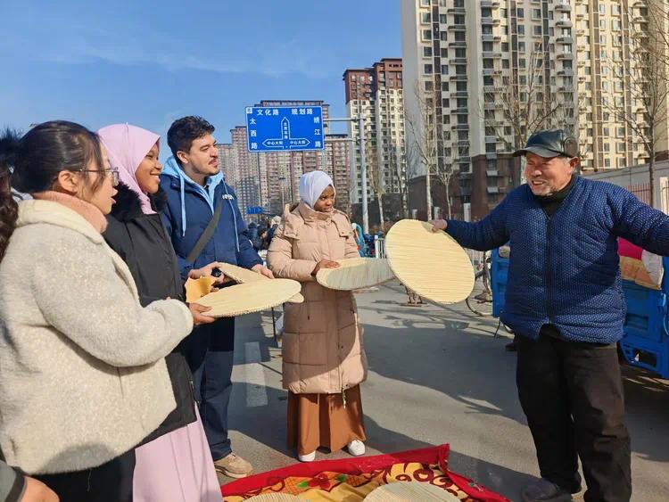 “这个豆腐是怎么做的?”在豆腐摊位前,来自坦桑尼亚的莎莎和英月抛出一连串问题。摊主一边切豆腐递来品尝,一边用夹杂方言的普通话笑着讲解。在年糕摊位前,他们了解制作工艺,品尝地道小张年糕;在煎饼摊旁,品尝现烙的煎饼。赶集中,他们的目光又被北套粉皮和手工编织的“盖帘”吸引,不禁停下脚步,饶有兴致地打量起来,好奇地询问其用途和编织技巧;看见春联和年画,他们询问图案寓意,“年年有余!过年就得图个吉利!”摊主笑着解释。