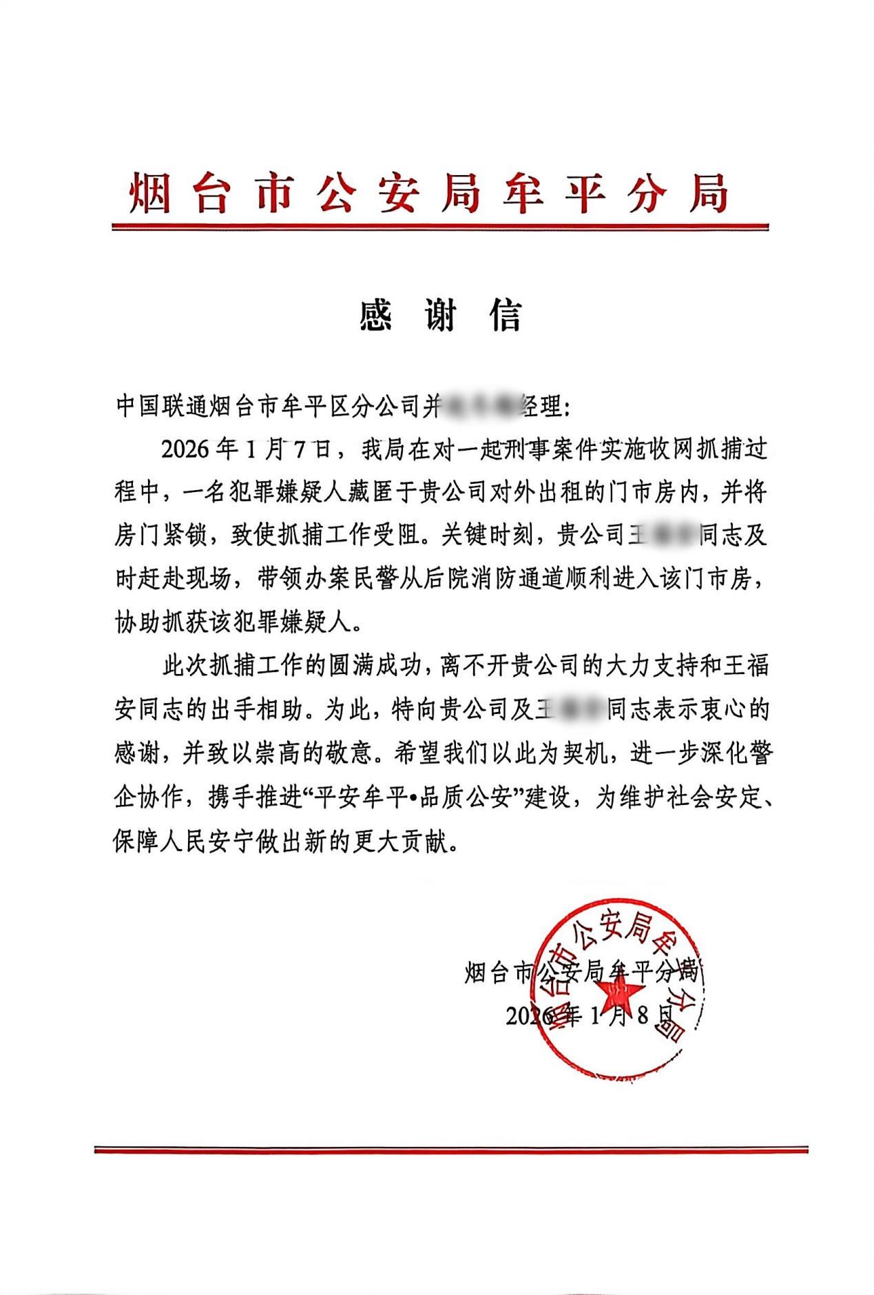牟平公安分局随后向牟平联通发来感谢信,表示“此次抓捕工作的圆满成功,离不开贵公司的大力支持和王同志的出手相助。”信中还特别指出,王先生在关键时刻所展现的社会责任感与协作精神,为案件顺利侦破提供了重要保障。