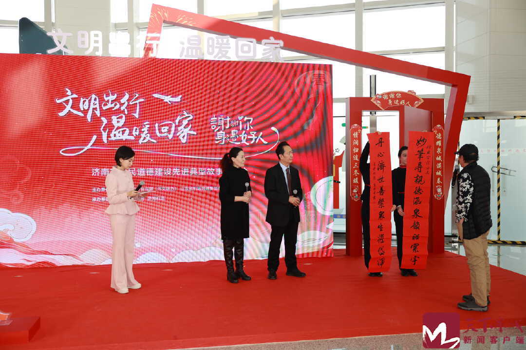 正值春运,本次活动聚焦“文明交通 礼行泉城”主题,通过视频《致敬坚守岗位的山东机场人》及现场表演,向春运期间坚守一线的机场工作者致敬。机场旅客服务部、机务保障部、安检部工作人员分别向出发、中转、到达的旅客送上温馨祝福。接下来,济南机场将以集团“好飞山东”服务品牌为指引,以“清泉暖途行动”为载体,全心投入、全力保障,温暖每一位旅客的春运归途。中国好人、国网济南市长清区供电公司孝里供电所所长王军利,向机场工作人员代表赠送了定制楹联。