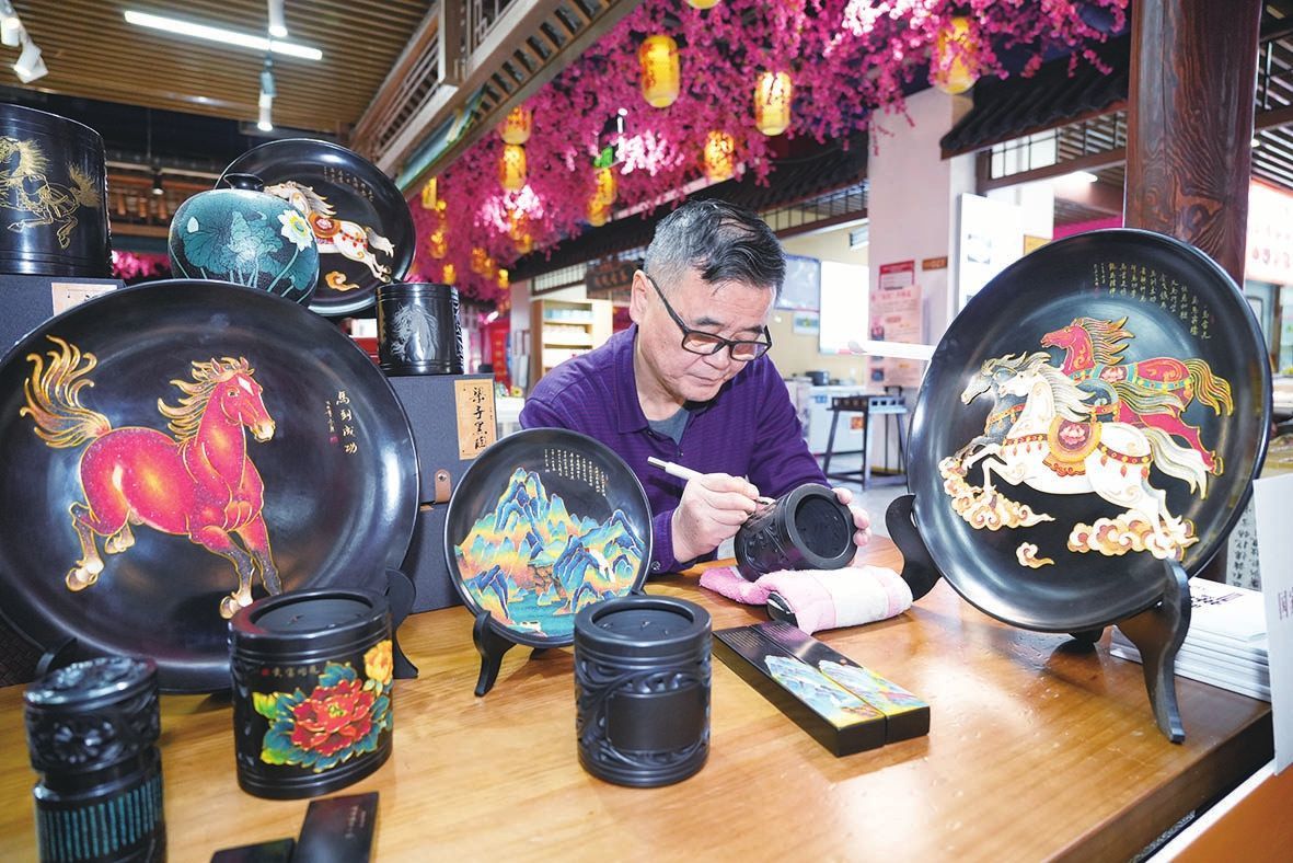 古今交融的脉搏,在集市的各个角落强劲跳动。手造非遗展区,“山东手造·德州有礼”汇聚了德州黑陶、德州红绿彩、金丝彩贴等精美工艺品。匠人们不仅热情展示着各自为丙午马年设计的文创产品,更邀请游客亲手拉坯、画陶、剪纸,让非遗在体验中传承。