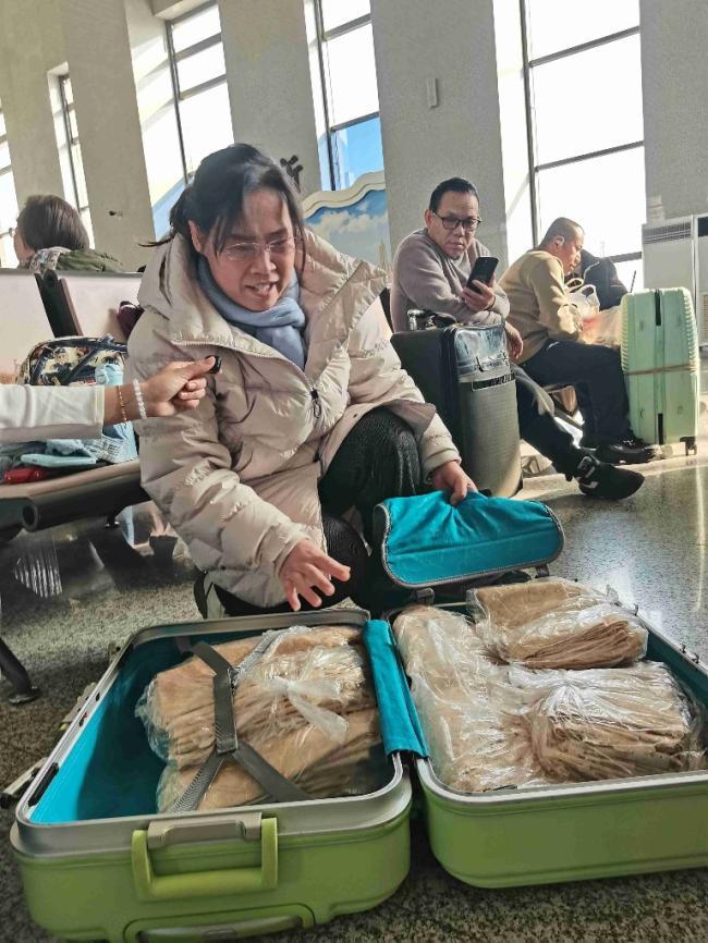 不仅归乡旅客对临沂煎饼情有独钟,即将前往济南访友的朱女士更是把煎饼当成了“硬核伴手礼”。她的行李箱被26斤煎饼塞得满满当当,还特意分装成了小份。“我朋友几年前来临沂旅游,吃了一次煎饼就念念不忘,总跟我念叨着想再尝尝。”朱女士一边整理行李一边说,这次特意多买了一些,足足26斤。“让她多分给身边的朋友尝尝,也让更多人知道咱临沂的特色美食。”