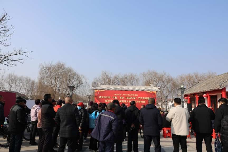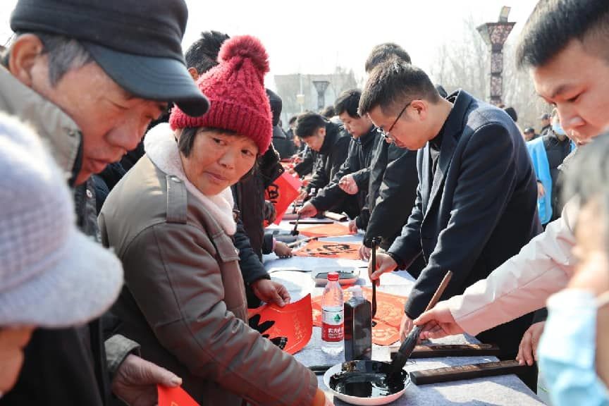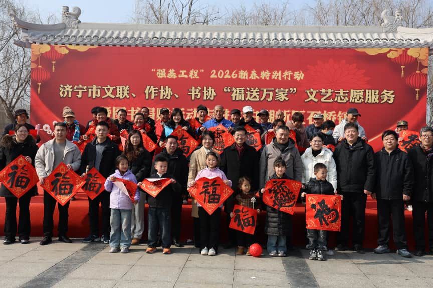 2月4日上午,济宁太白湖新区石桥镇泗凫渡红色文化广场上一片欢声笑语、红火喧腾,“强基工程”2026新春特别行动——济宁市文联、市作协、市书协“福送万家”文艺志愿服务暨图书捐赠活动在这里隆重举行。活动以“送祝福、种文化”为核心,旨在通过写福字送春联、捐赠图书、乡村书法传习馆揭牌等多种形式,将文艺的种子播撒基层,助力和美乡村建设,为即将到来的农历丙午马年春节注入浓浓的文化年味。
