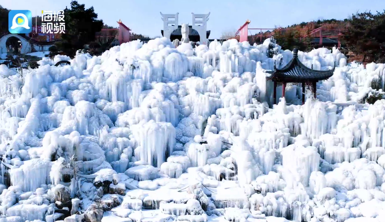 冰帘悬绝壁,雪练落深潭,威海华夏城绝美冰瀑惊艳亮相,仿若踏入人间仙境,美不胜收!(来源:大众网 记者 林啸 威海报道)