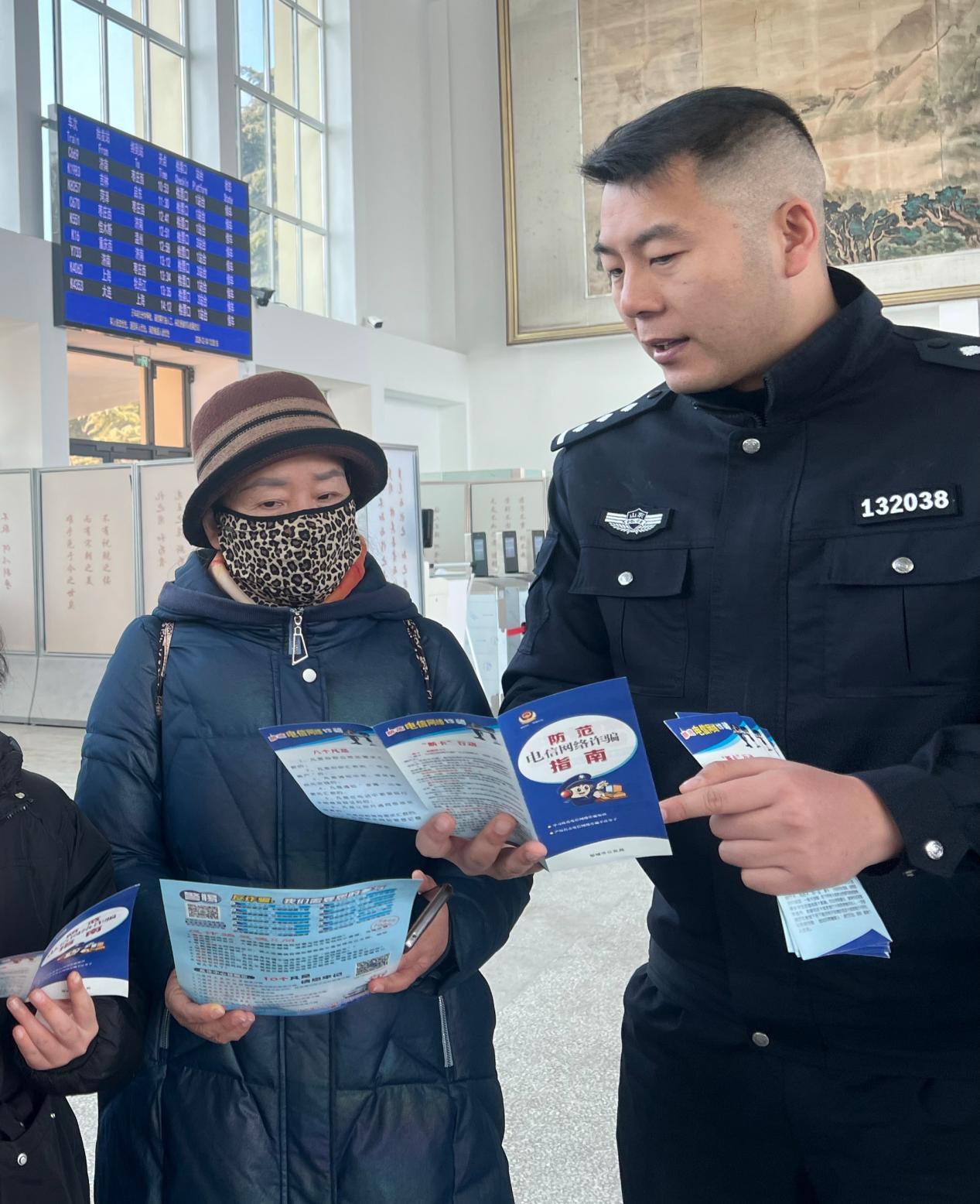 春运期间,为提高返乡务工人员及假期学子的反电诈防范意识。2月4日,邹城市公安局民警走进该市火车站开展反电诈宣传活动。