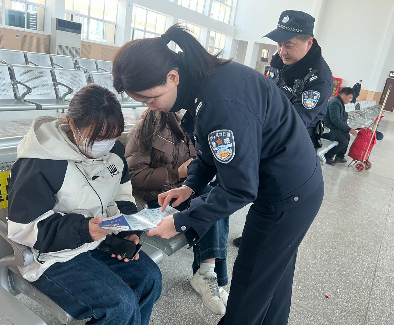 同时他们对来往旅客讲解当前的电诈形势,列举典型的诈骗类型及案例,提醒广大旅客提高警惕、加强防范,守好钱袋过新年。