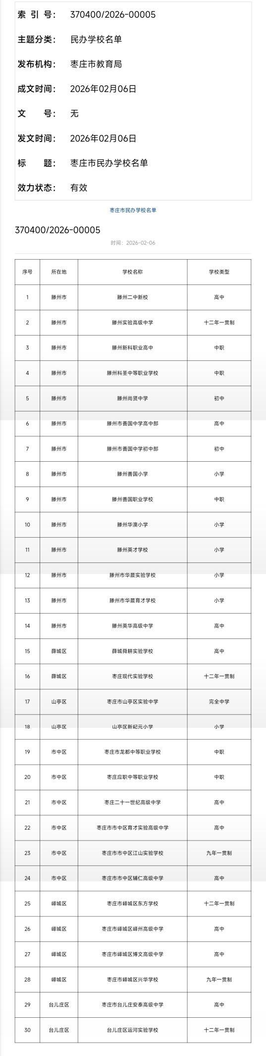 近日,枣庄市人民政府官网公布《枣庄市民办学校名单》,共计30所学校,具体名单如下: