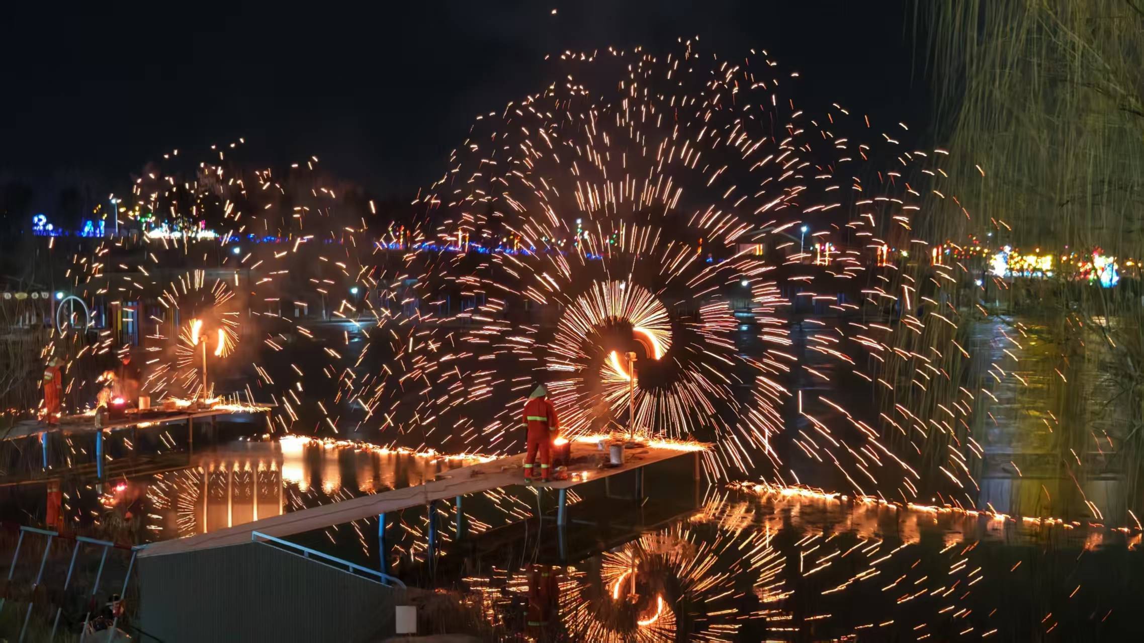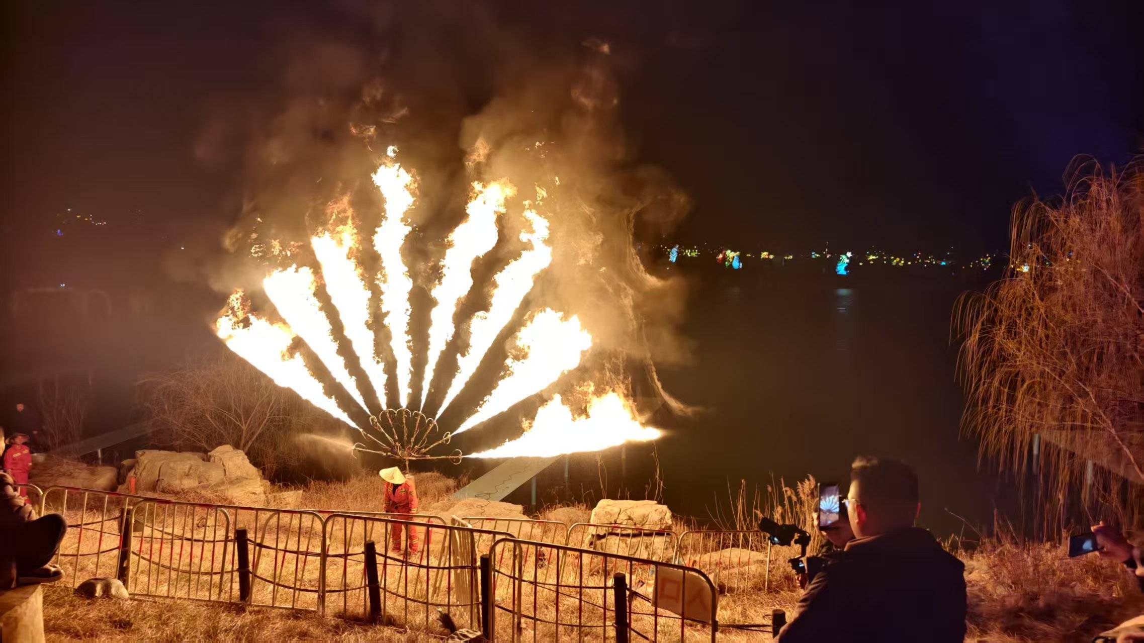 本届灯会不仅是静态的光影艺术展,更是一个充满活力的综合性新春文化盛会。舞台现场,气势磅礴的歌舞刚劲有力,舞出了昂扬的精神气;趣味横生的演员与游客亲切互动,送出新年祝福;极具地方特色的渔家锣鼓与秧歌,则让浓浓的胶东年味扑面而来。湖边惊险绚烂的火艺秀将现场气氛推向高潮,火花划破夜空,赢得阵阵喝彩。