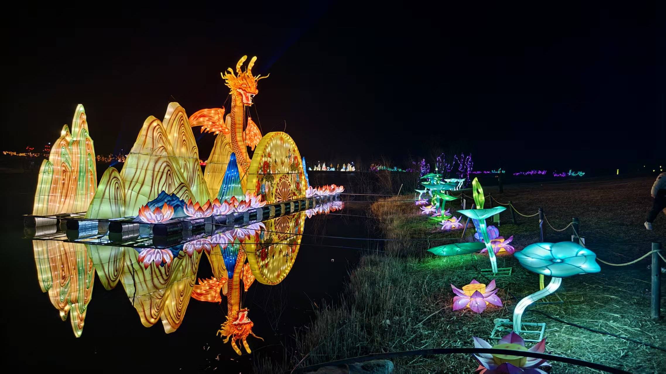 湖面之上,本届灯会最为瞩目的视觉奇观——“超级水上飞龙”盘踞于粼粼波光之中。这条巨龙,龙身倒映在夜色水影里,与真实的灯光本体虚实相生,气势恢宏,成为现场极具人气的拍照打卡点。不远处,巨型“祈福花灯”通体透亮,祥云瑞兽图案栩栩如生,寄托着人们对新年的美好祈愿,吸引众多游客驻足许愿。