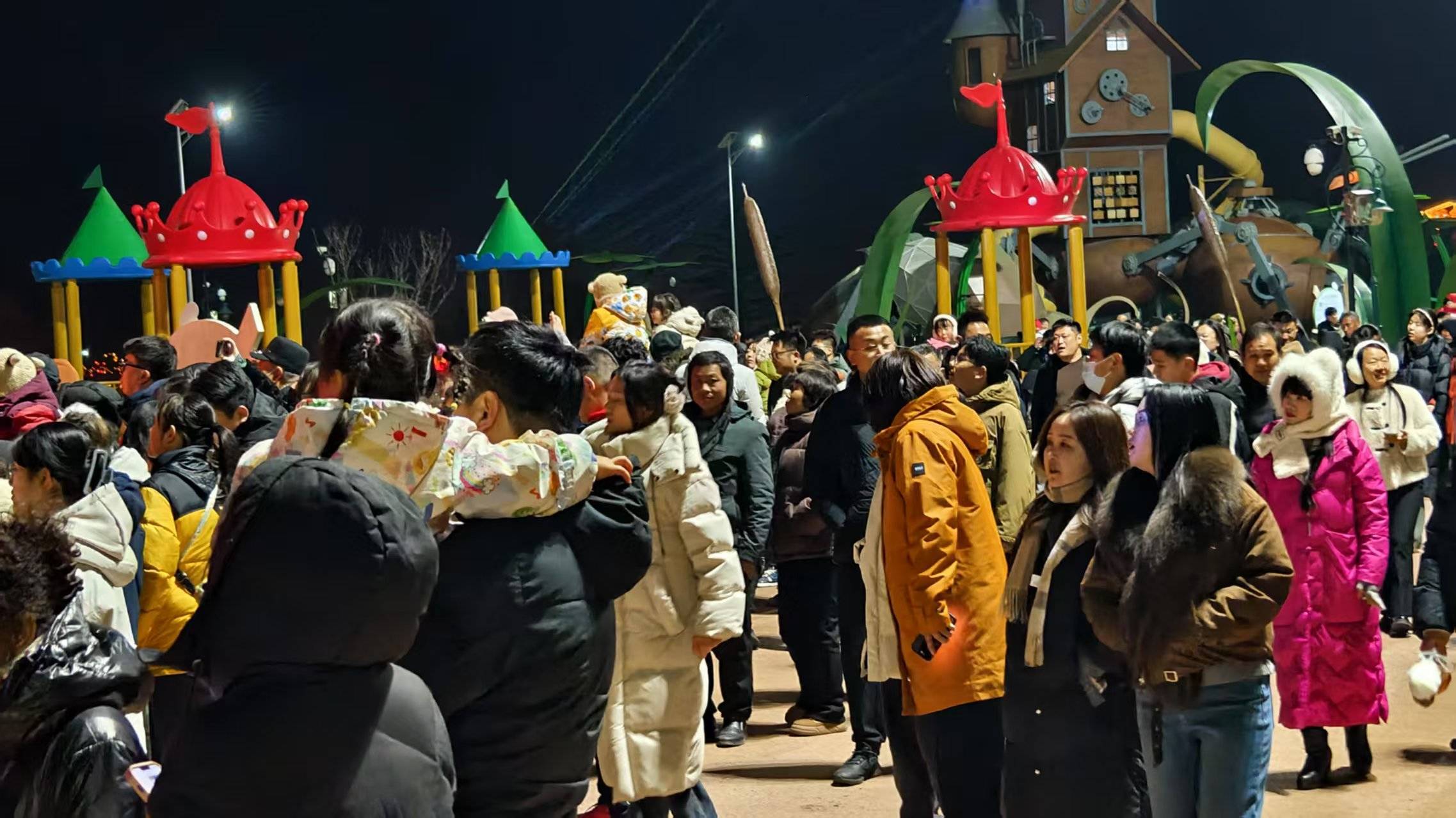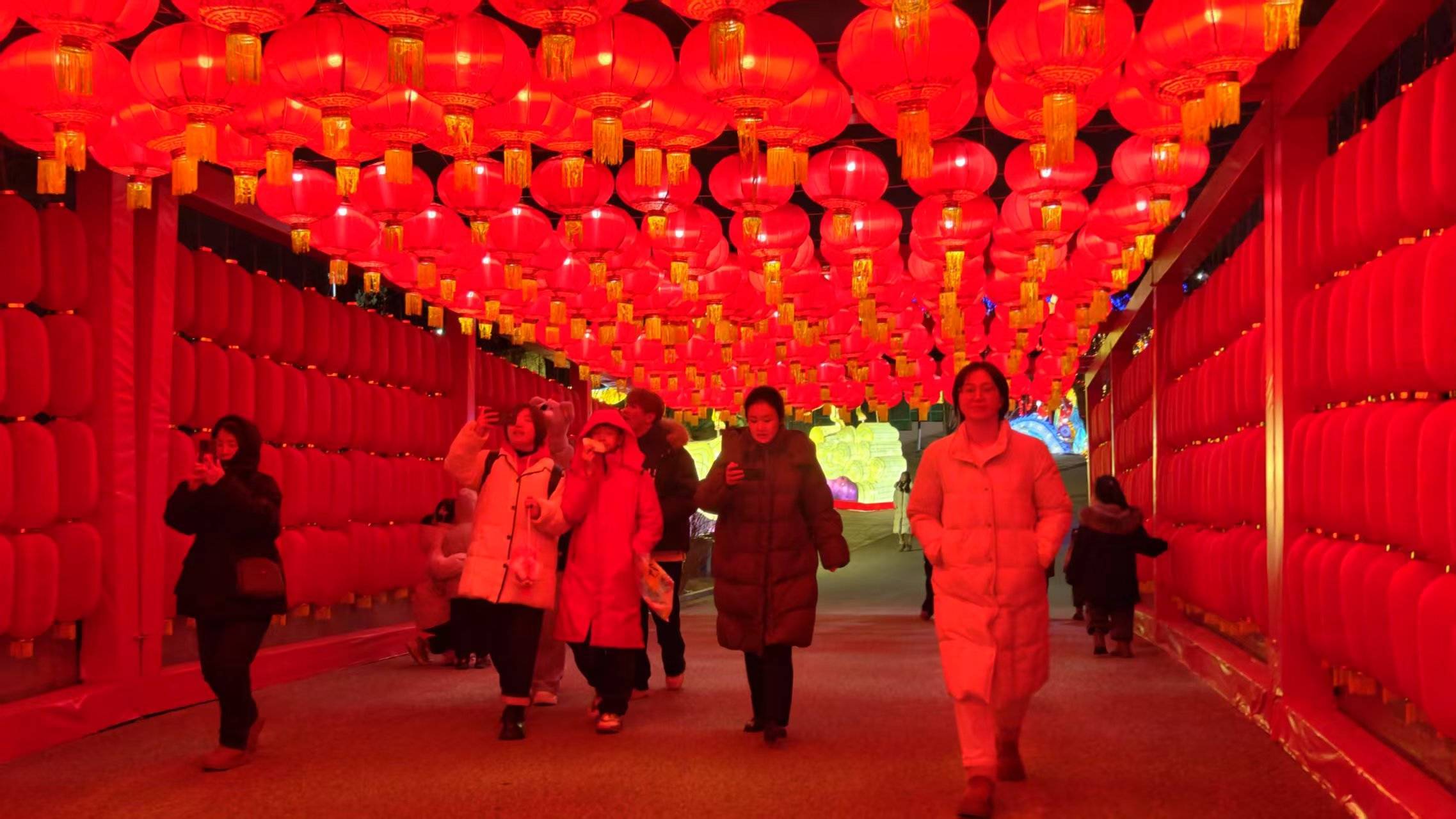 傍晚时分,伴随着喜庆的鼓乐,被誉为灯会璀璨门户的大门华灯齐放。这座宽26米、高12米的巨制,以盛情之姿迎接着八方来客。园区内,六大主题区域、53组大型花灯同时点亮,构成一幅幅瑰丽壮观的立体画卷,引得首批入园游客惊叹连连,纷纷举起手机记录这流光溢彩的瞬间。