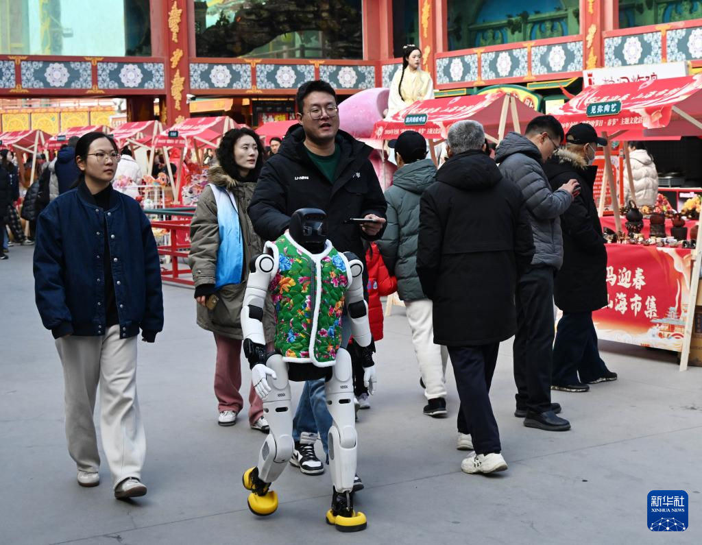 2月10日,2026年全国“我们的节日·春节”主题文化活动山东示范活动在青岛启动。本次活动以“跃马启新岁 山海迎新春”为主题,旨在营造喜庆氛围、丰富新春体验的同时提振节日消费。 图为2月10日,在青岛市城阳区山海间不夜城主题街区,一台人形机器人在“逛”非遗大集。新华社记者 李紫恒 摄