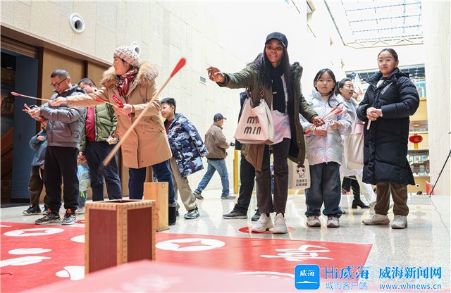 互动体验区同样热闹非凡,漆扇摊位前围满了市民,大家发挥创意,在素白扇面上打造专属的新春图案。拉洋片体验区不时传来阵阵惊叹,老艺人摇动转筒、讲述民俗故事,为孩子们展示传统曲艺的独特魅力。来自尼日利亚的山东大学(威海)留学生礼物(中文名)体验了投壶和剪纸艺术,她说:“这里的迎新年活动很丰富,让我了解到好多有趣的非遗项目。”