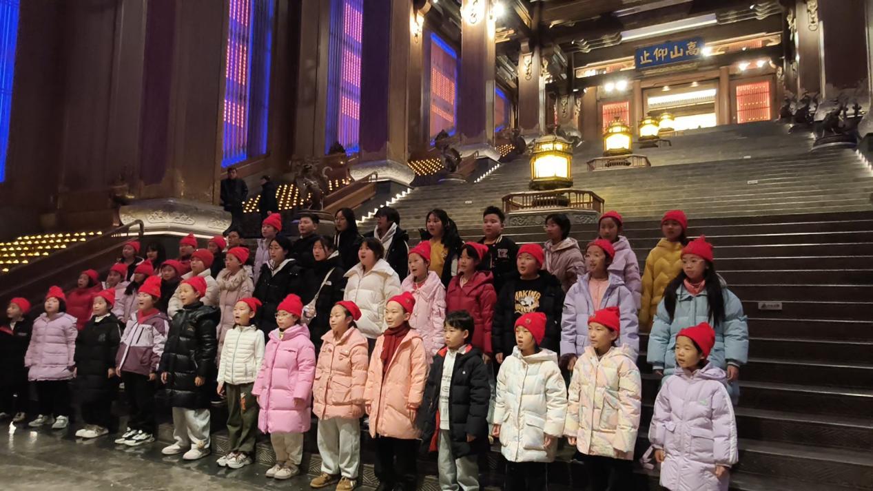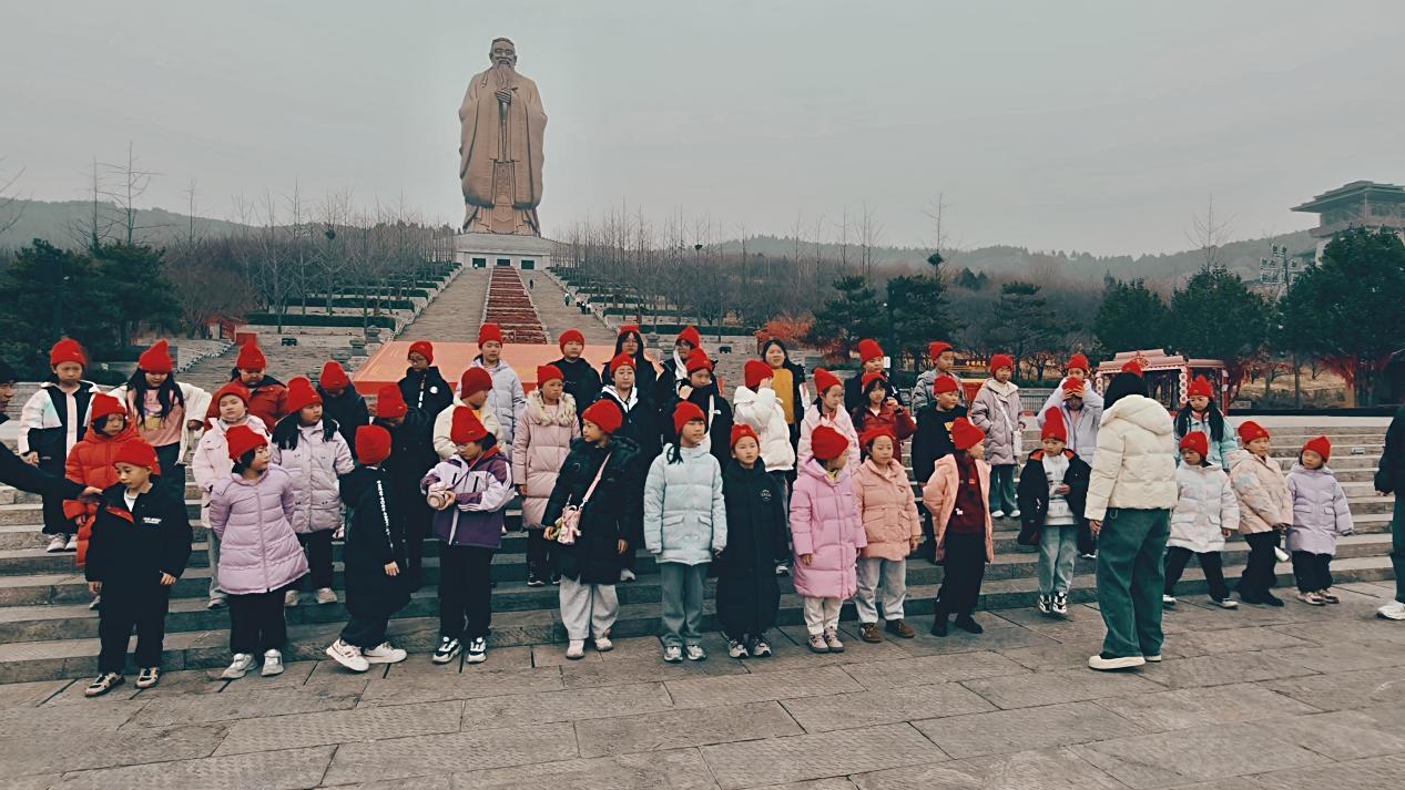 2月3日上午,研学之旅继续在东方文化圣地进行。潍坊爱乐童声合唱团与安丘市锦湖小学小树苗合唱团的师生们共同走进济宁曲阜尼山圣境。在巍峨的孔子像下,在恢弘的大学堂内,孩子们怀着敬意演唱了精心排练的曲目。当合唱声在象征中华文明精神空间的大厅中悠然响起,传统礼乐文化与当代童声艺术完成了跨越千年的深情呼应。这场沉浸式研学快闪,不仅是一次深刻的文化体验,更是一次生动的爱国主义与传统文化教育,真正实现了“在游中学、在唱中悟”。