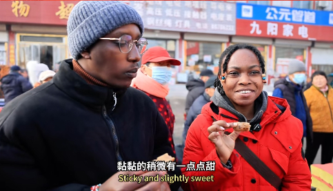 沿着集市前行,外籍友人们被刚出锅的粘窝窝和年糕吸引。冒着热气的传统年节食品让他们既好奇又期待。在摊主的热情邀请下,莉亚小心地品尝了一小块年糕,“甜甜的、黏黏的,很特别的口感!”她笑着说,这是她第一次知道中国新年要吃这种食物。
