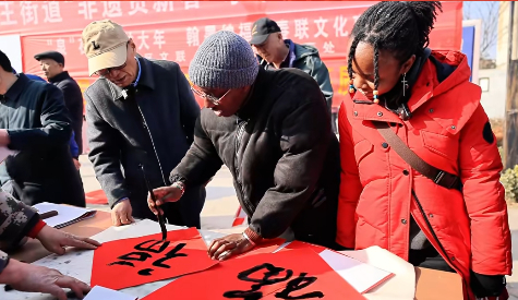 活动的重头戏在集市中心的传统文化体验区展开。唐王街道的老艺术家们早已准备好笔墨纸砚,耐心指导外籍友人书写春联。来自肯尼亚的悦然第一次握毛笔,在老师手把手的指导下,完成了“福”字的书写。“虽然不熟练,但这个过程让我感受到中国书法艺术的魅力,”她表示,“我要把这幅作品带回肯尼亚。”