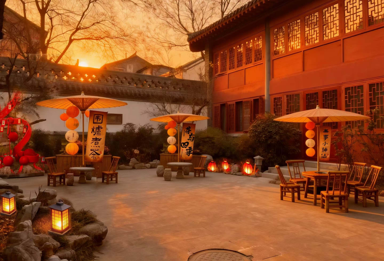 “马上有喜市”汇集南北风物、手作茶饮,融合非遗体验与围炉煮茶。东院古诗词灯牌点缀,西院柿子树下暖光融融,氛围感直接拉满。