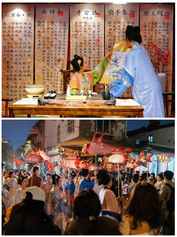 每日十余场定点演艺与日夜双线巡游:既有《快哉清照》的诗意演绎,又有《滚灯乐舞》的市井欢腾,日间“古风快闪巡游”,夜间“鱼灯祈福巡游”,现场NPC化身泉城名士、卖花货郎,与市民游客互动合影,随机派发新春糖果。