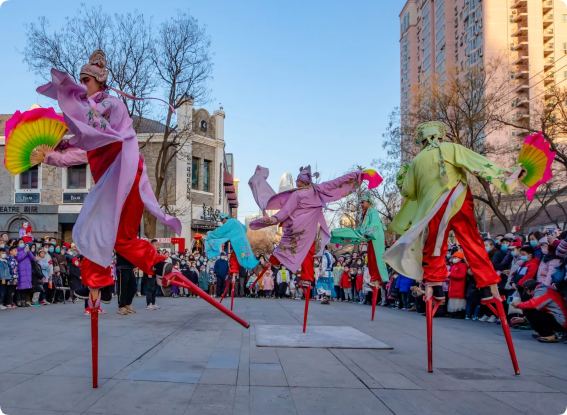 舞龙舞狮、高跷秧歌、古风乐器巡游,从除夕到初五,每日多场轮番上演,为您送上满满福气。