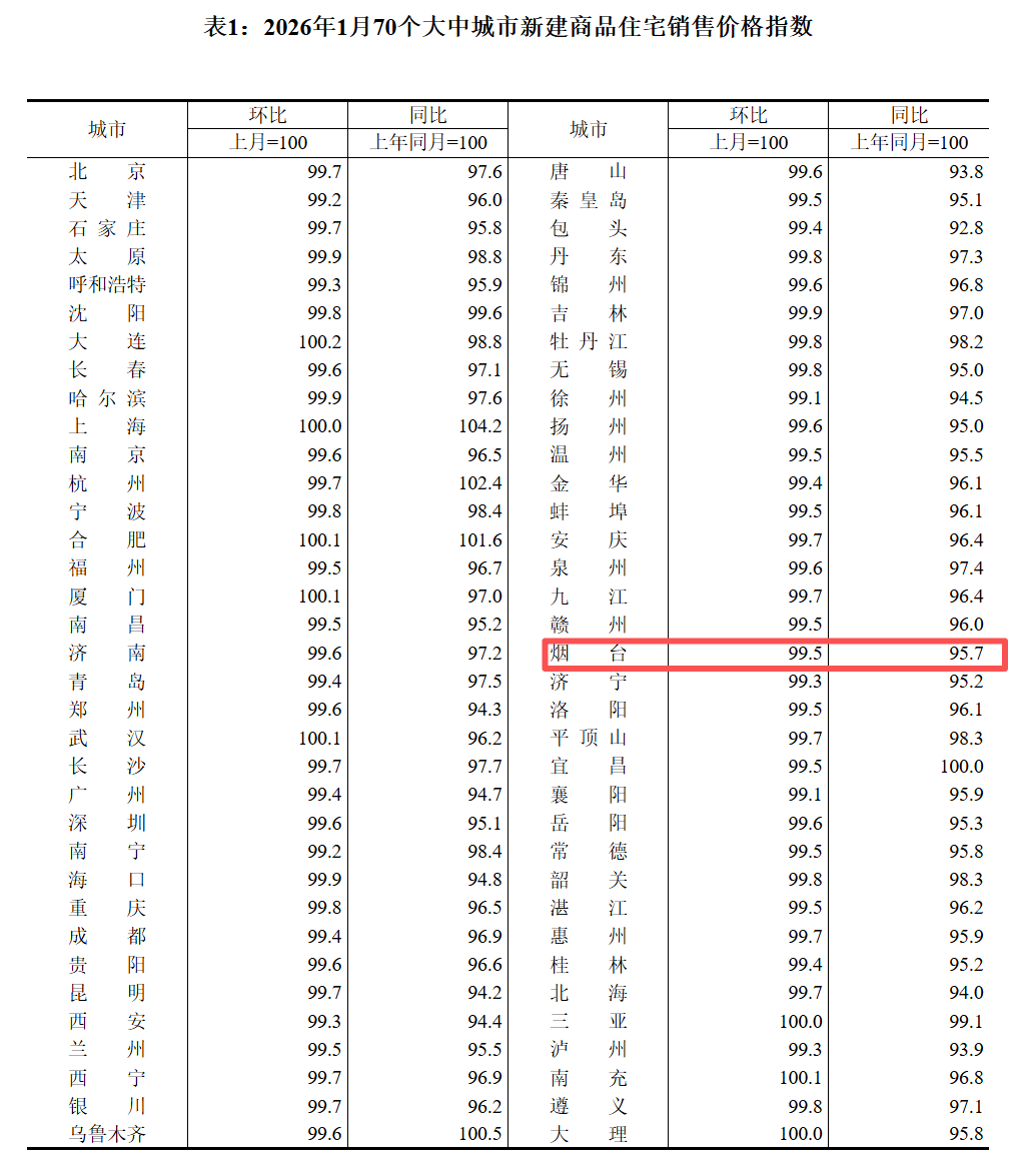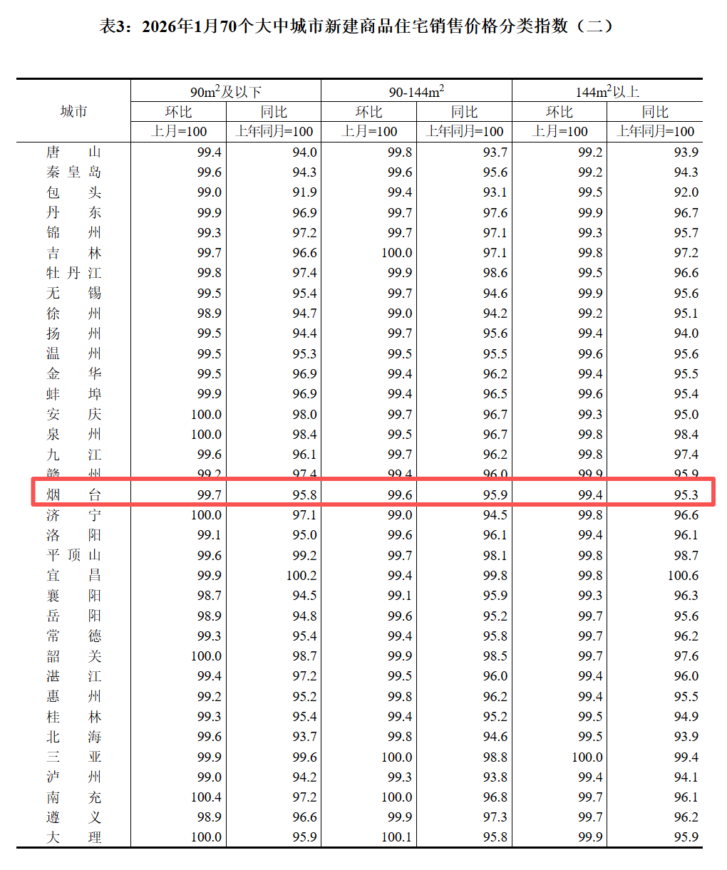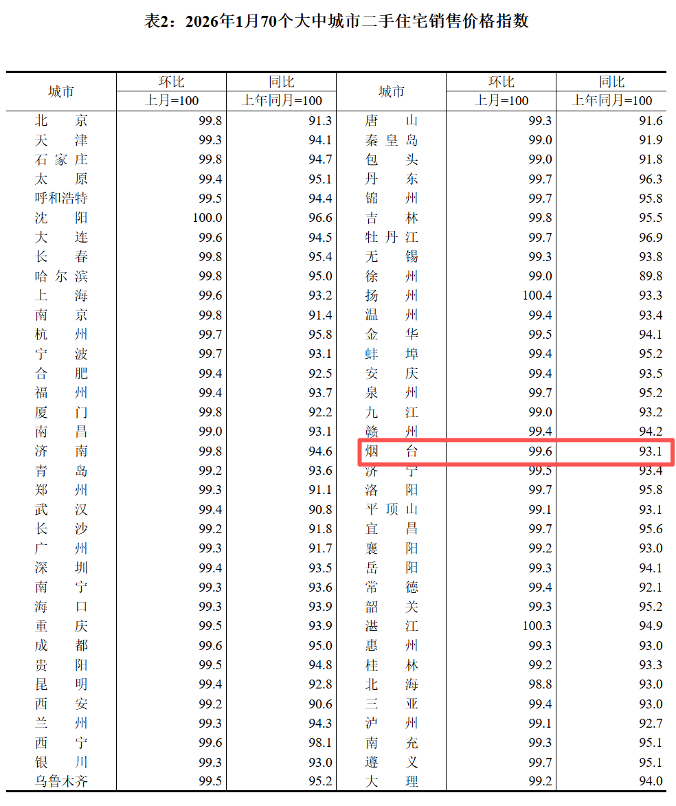 大小新闻客户端2月13日讯(YMG全媒体记者 杨健)今天上午,国家统计局发布了2026年1月份70个大中城市商品住宅销售价格变动情况。1月份,烟台新房环比2025年12月下降0.5%,同比2025年1月份下降4.3%;二手房方面,烟台二手房环比2025年12月下降0.4%,同比2025年1月下降6.9%。