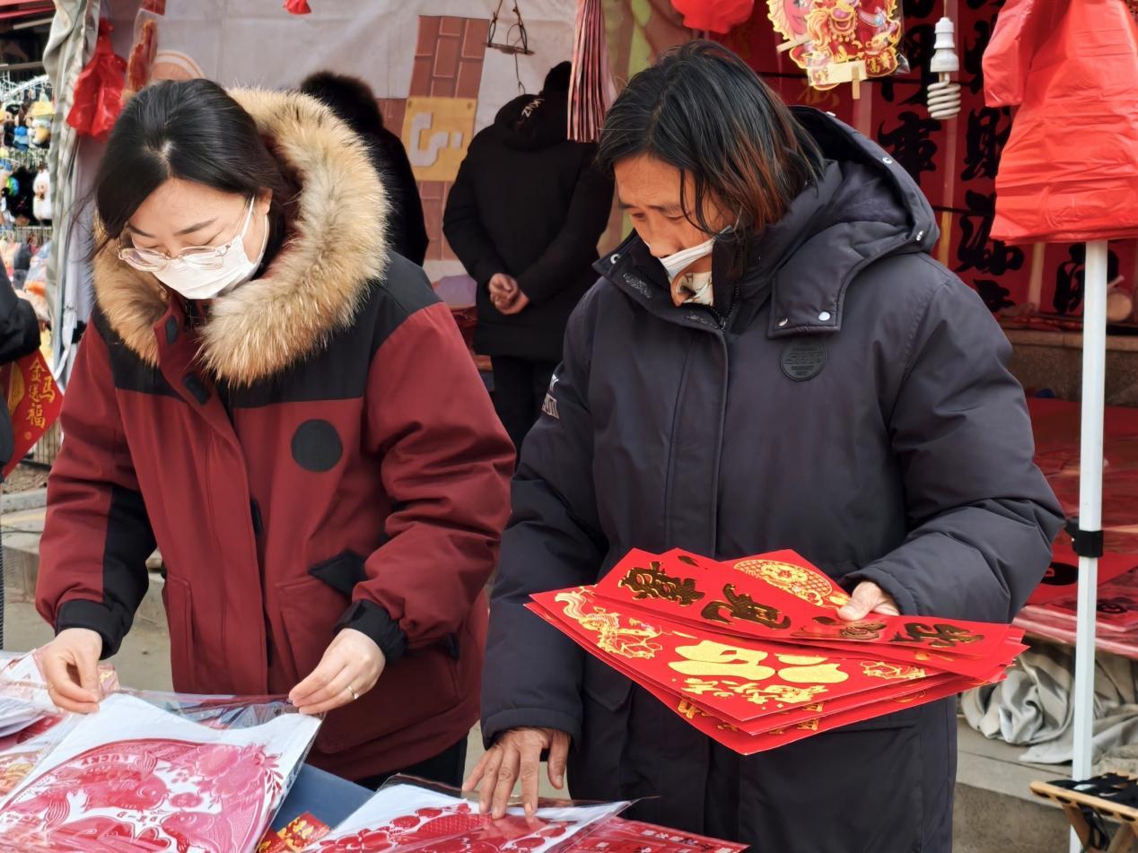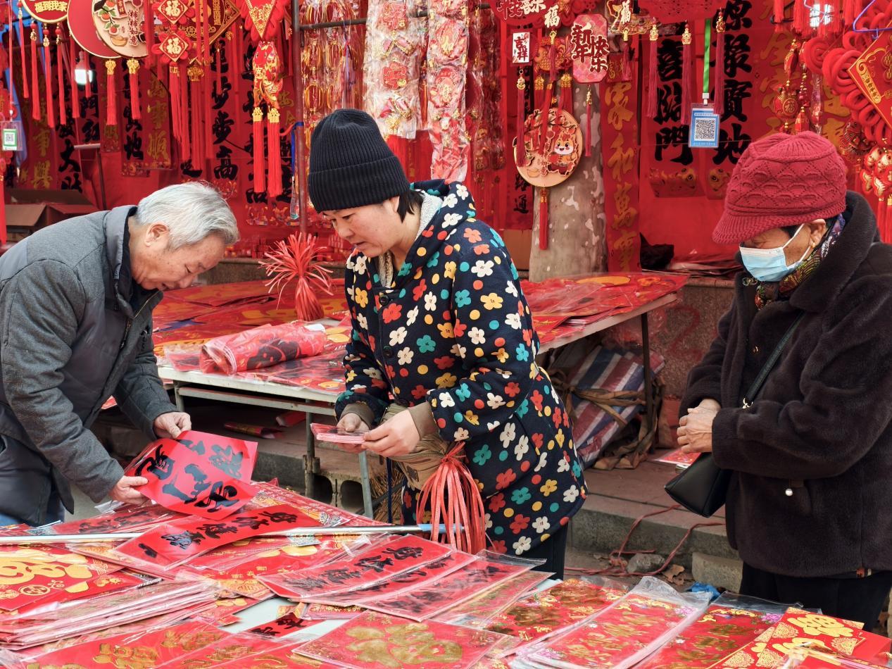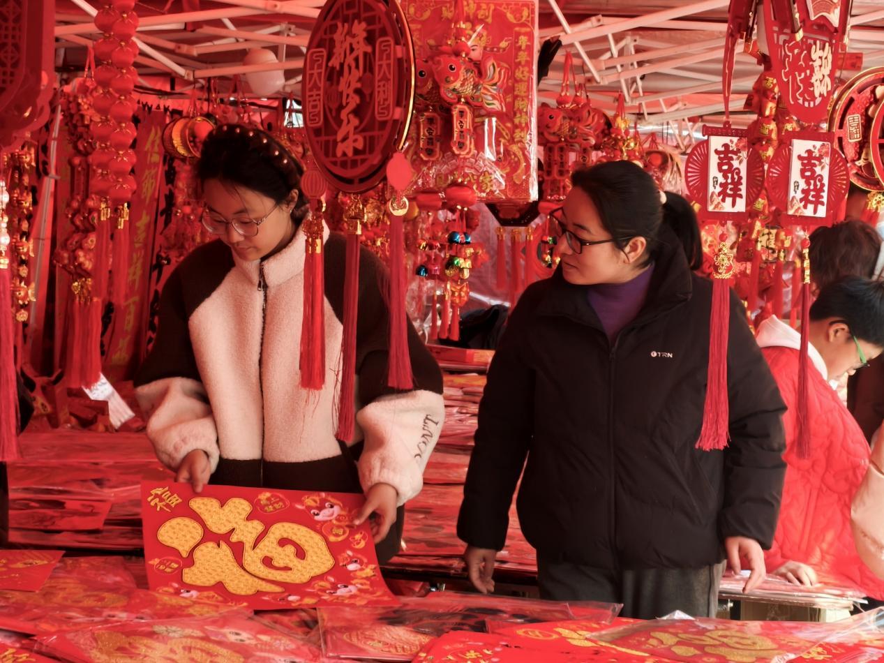 2月13日,枣庄市薛城区古路街年货市场,市民在春联摊位前精心挑选福字、春联和新年挂饰。红彤彤的年货琳琅满目,浓浓的年味扑面而来。