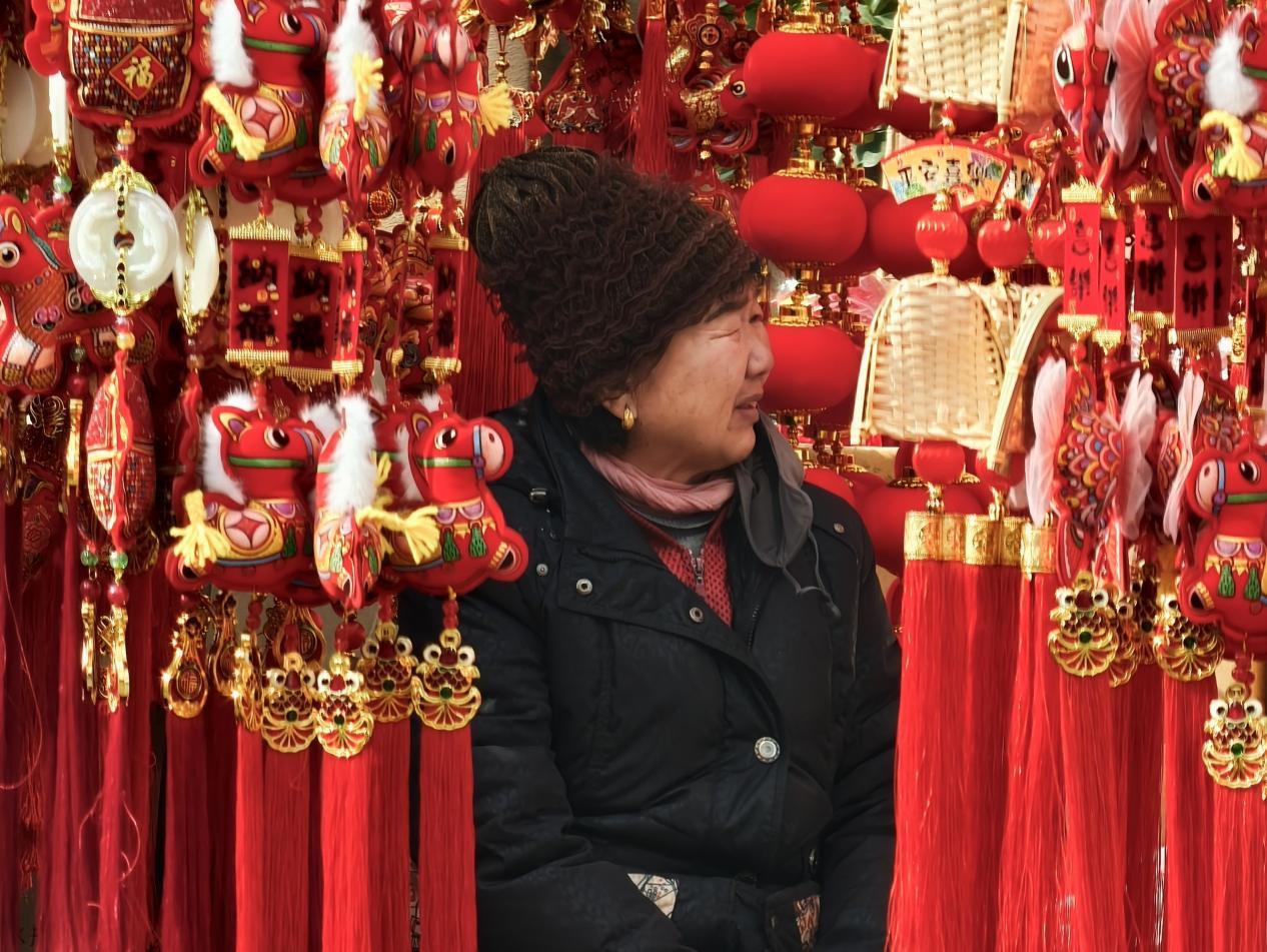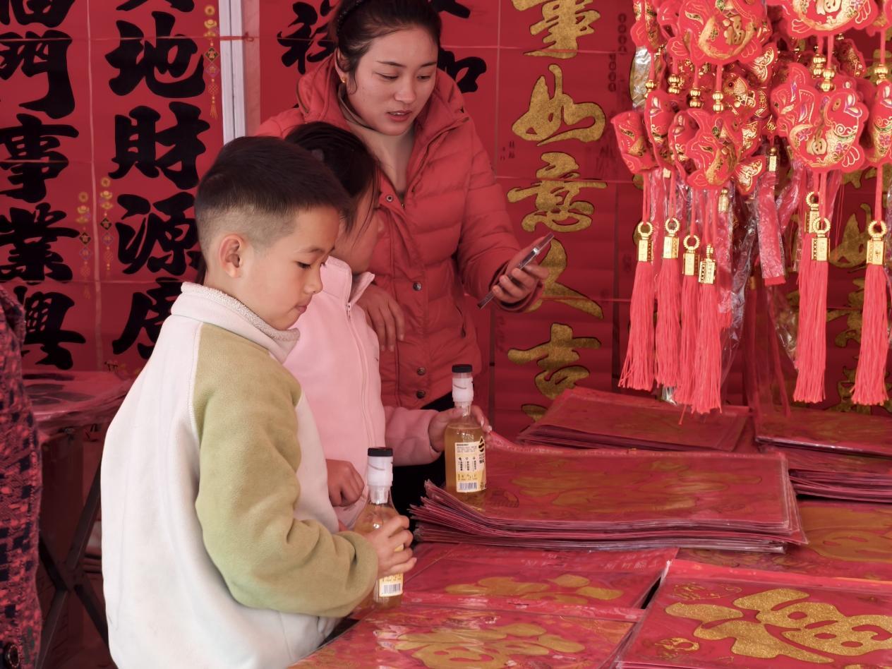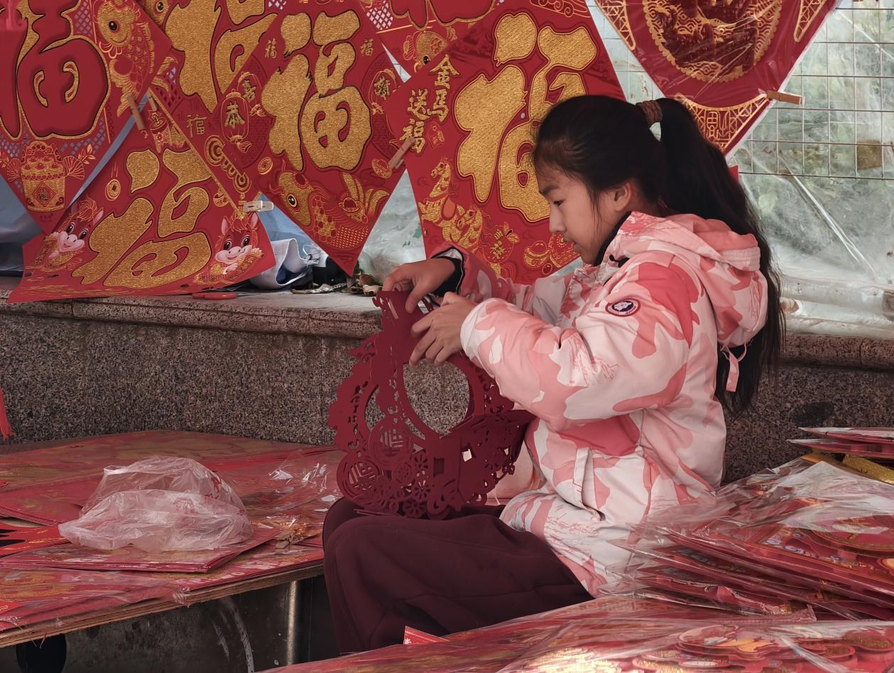2月13日,枣庄市薛城区古路街年货市场,市民在春联摊位前精心挑选福字、春联和新年挂饰。红彤彤的年货琳琅满目,浓浓的年味扑面而来。