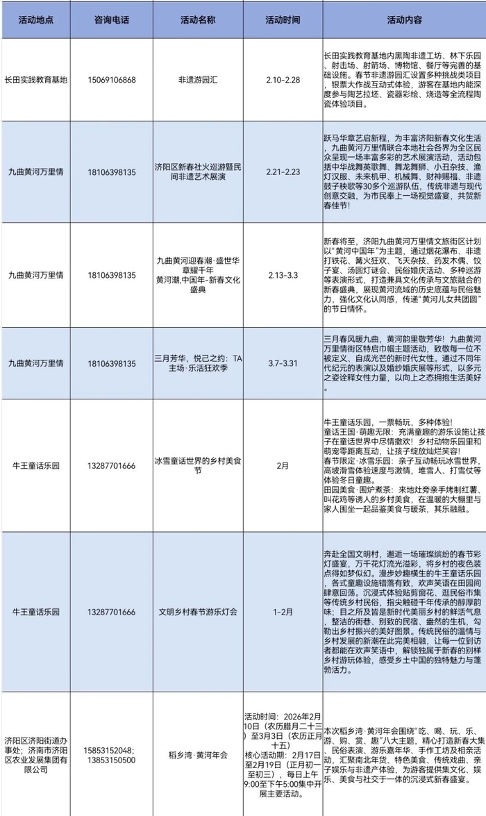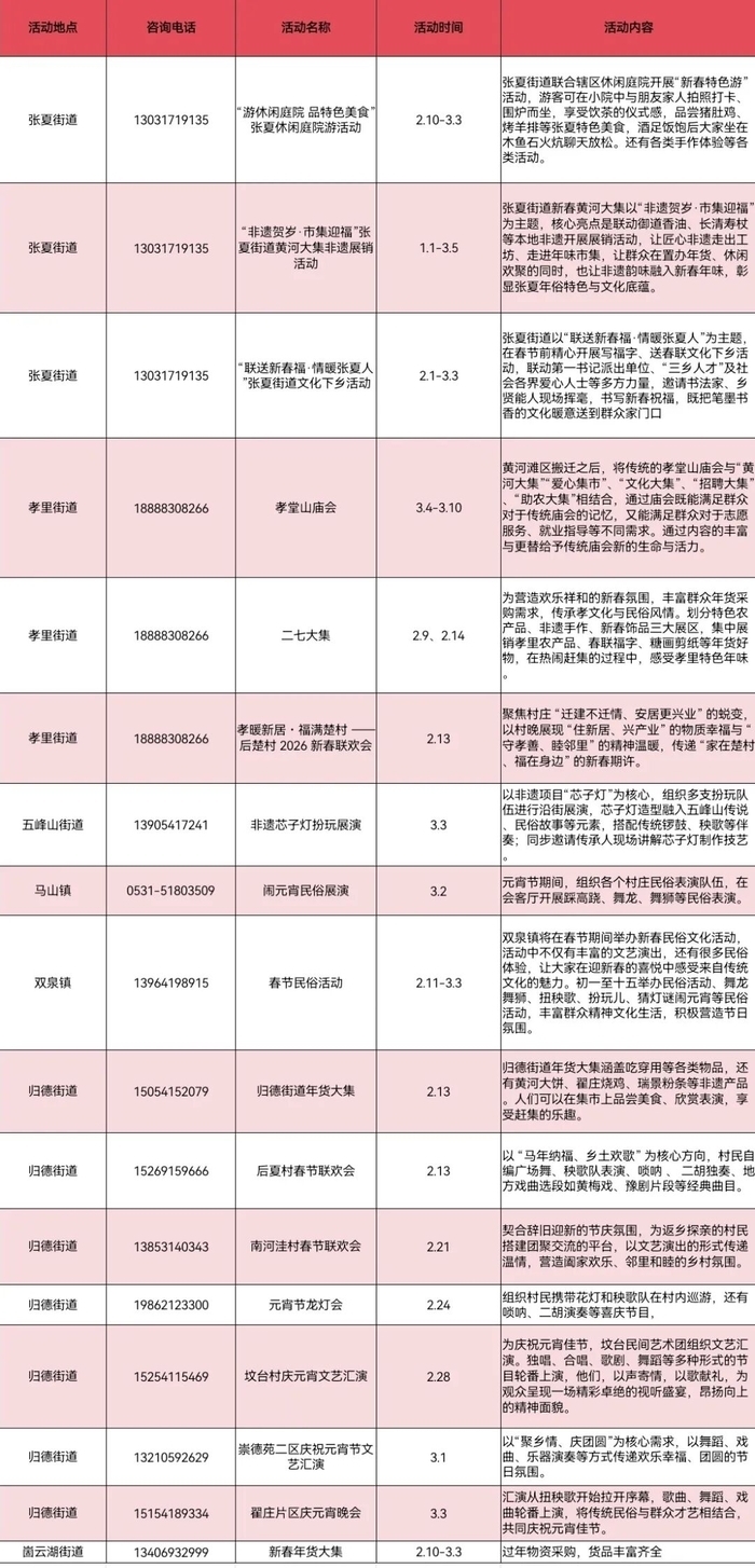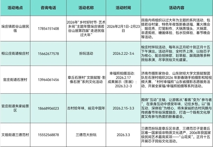 新春时节,泉城乡村年味正浓。济南市文化和旅游局联合各区县(功能区)文旅主管部门依托本土文化与特色资源,推出形式多样、亮点纷呈的乡村旅游活动。从非遗民俗到年味市集,从祈福体验到休闲慢享,勾勒出一幅热闹喜庆、底蕴深厚的新春乡村画卷,让市民与游客在乡野间寻年味、品民俗、享团圆。