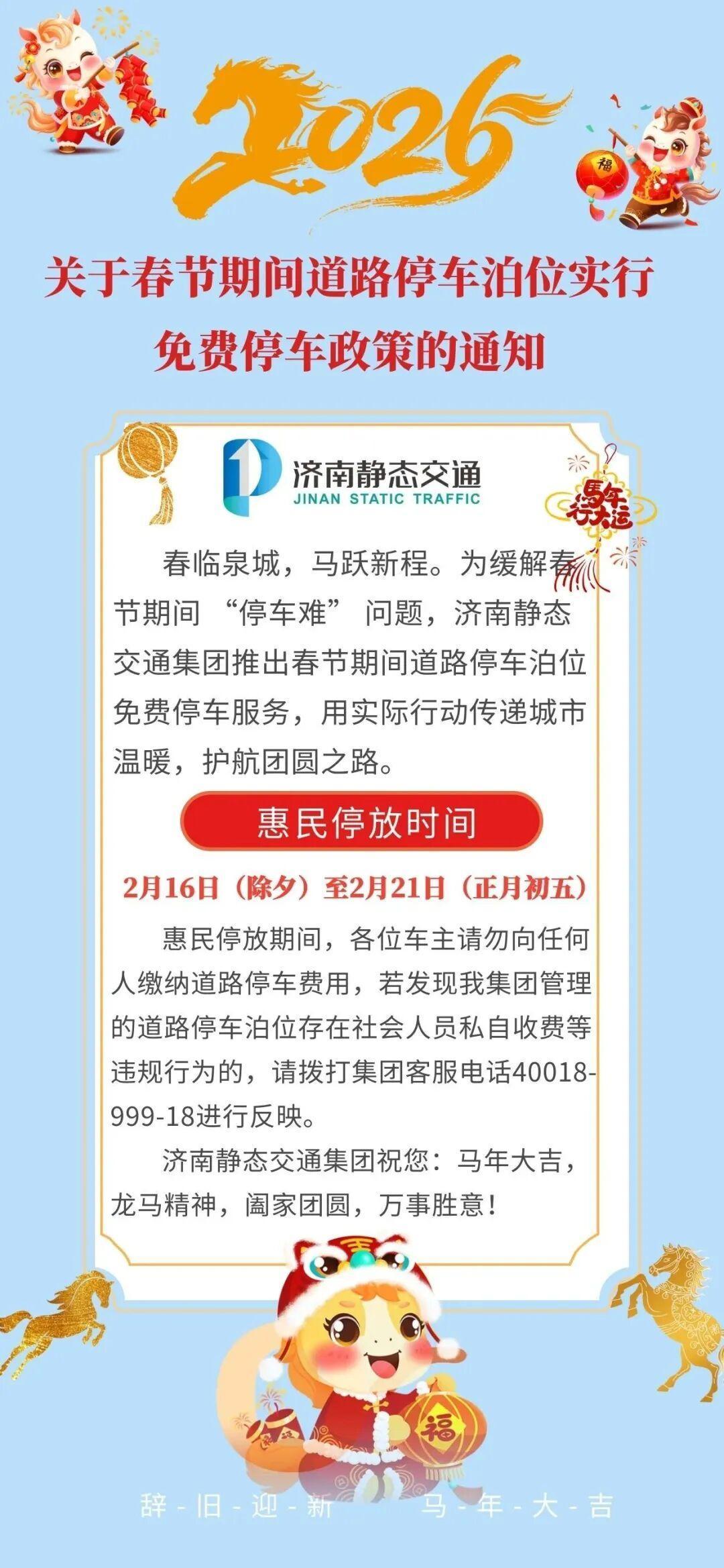 2月13日,济南静态交通集团发布通知,2月16日(除夕)至2月21日(正月初五)期间,全市道路停车泊位向社会车辆免费开放,两万余个车位让市民走亲访友、逛吃游玩的团圆路少了“停车难”的烦恼,多了“暖心窝”的温情。