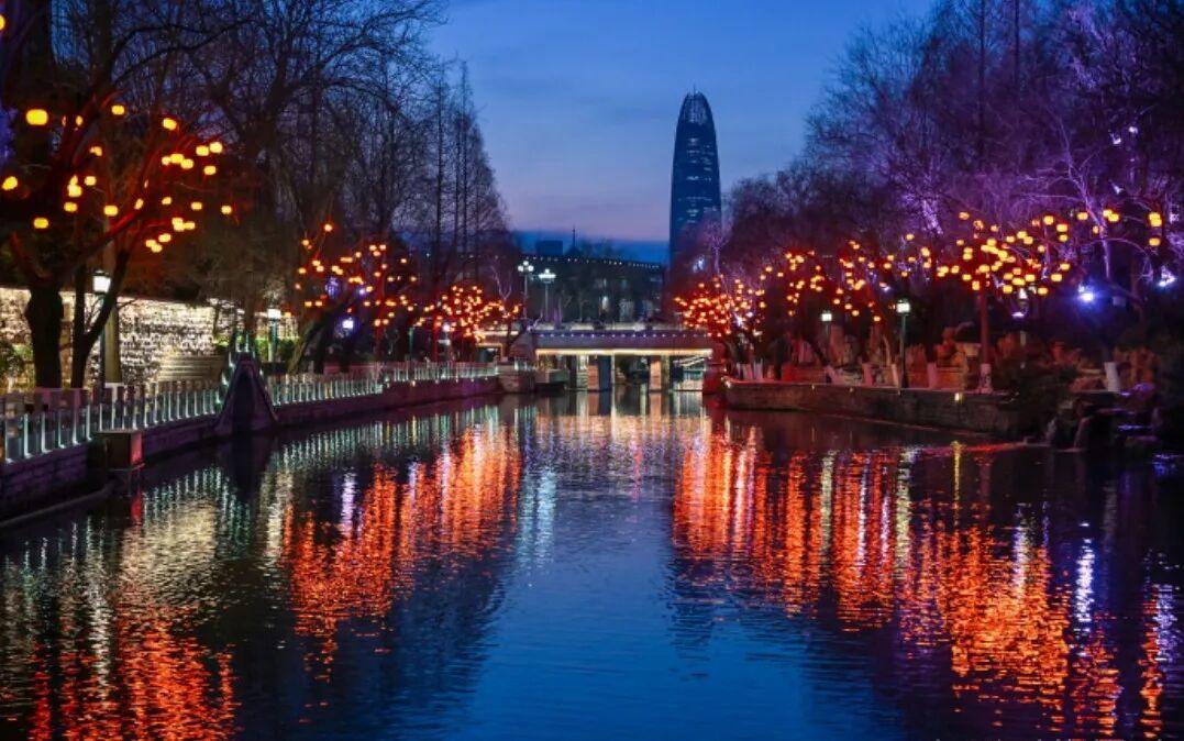 护城河两岸已悬挂起数千只寓意“柿柿如意”的柿子灯笼,夜色中水波与灯光摇曳生姿。