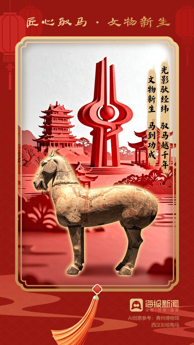 以“马”为创意纽带,融合山东孔庙儒风、泰山巍峨、黄河奔涌、文物焕彩、海洋浩瀚等元素,推出系列新春海报,尽显齐鲁文化赓续、山河锦绣、古韵新生、蓝海腾飞、乡野焕活、科创领航之盛景。