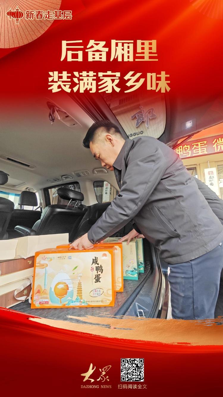 后备厢里,微山湖咸鸭蛋码得整整齐齐,几袋真空包装的手工藕粉用红绳系着,最显眼的还是那四盒印着“滕州非遗”字样的板鸭,这些年货把后备厢塞得满满当当。