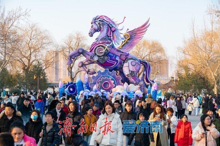作为市集的重点区域,大明湖南岸正谊广场的10米巨型花灯“马力全开”是一大吸睛亮点。灯组采用赛博朋克的机械美学风格,金属机甲搭配霓虹光效,将“马到成功”的传统吉祥寓意与未来科技感融合,传递2026年奋进向前、动能满格的新春期许。