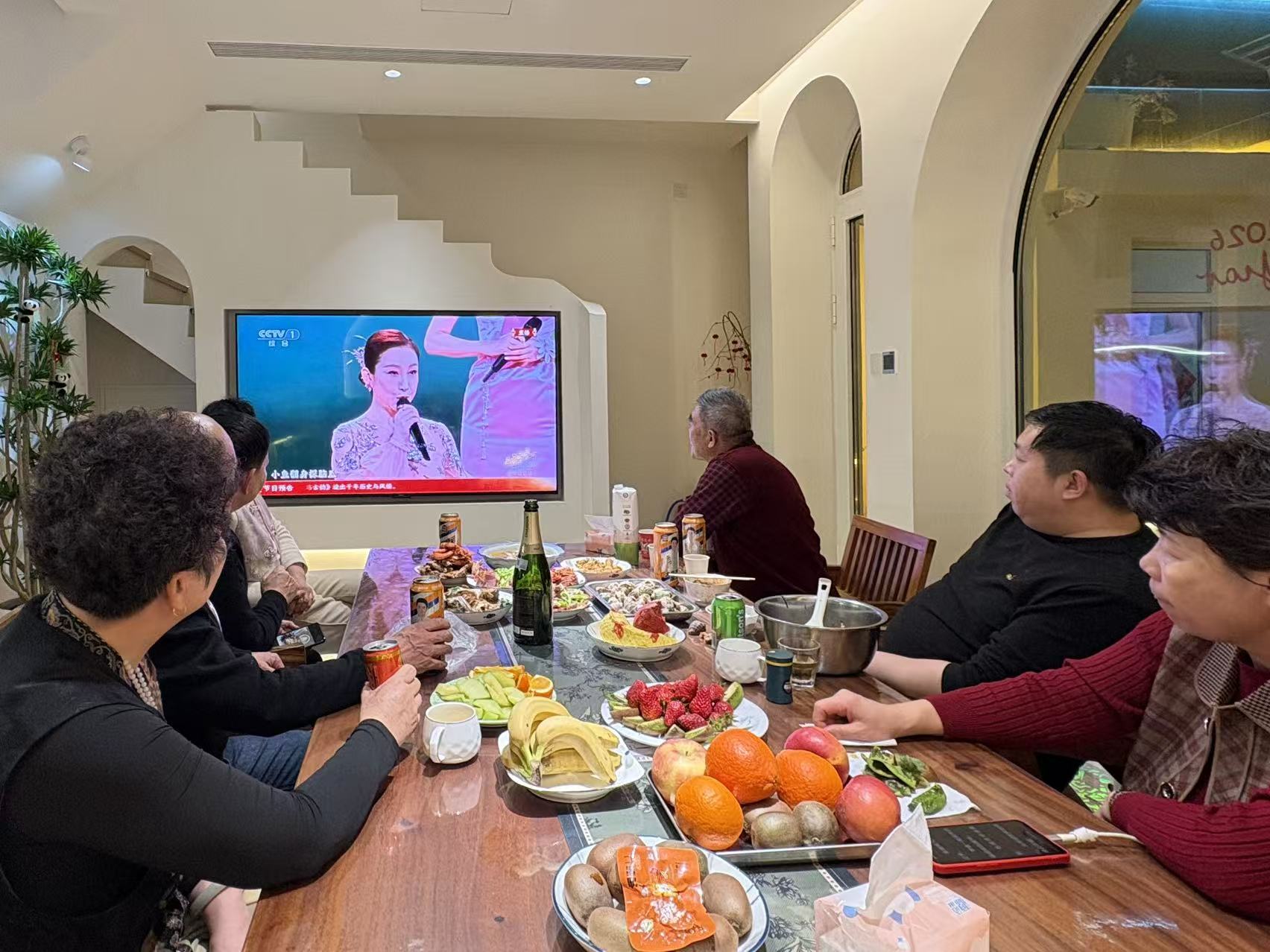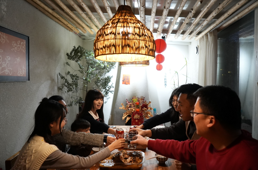 主理人庄秀珍麻利地收拾着各式海鲜,与李先生一家一起准备年夜饭。夜色渐浓,民宿房间里灯火通明,满屋的人围坐在一起看春晚、话家常,虽身处异乡,却满是团圆的欢喜。