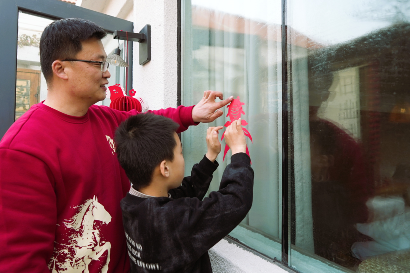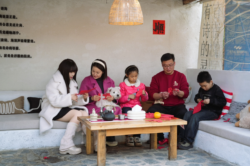 “来,左手按住红纸,右手慢慢剪,咱们日照剪窗花,讲究的就是吉祥喜庆!”暮色渐浓,枕上•诗海民宿的小院里暖意融融,主理人成兵正带着入住的游客们围坐一桌剪窗花。红纸在指尖翻飞,剪刀开合间,金鱼、蝴蝶、春字等纹样渐渐成型,游客们互相展示着自己的作品,笑声顺着窗棂飘向远方。