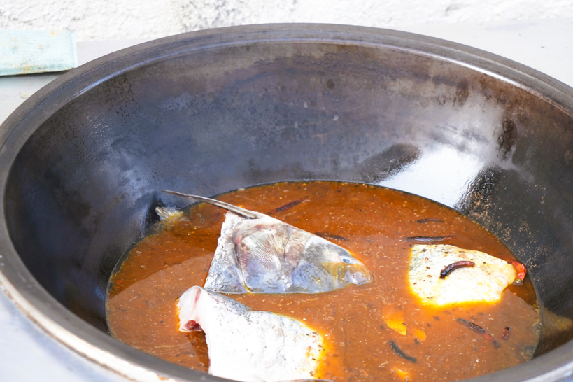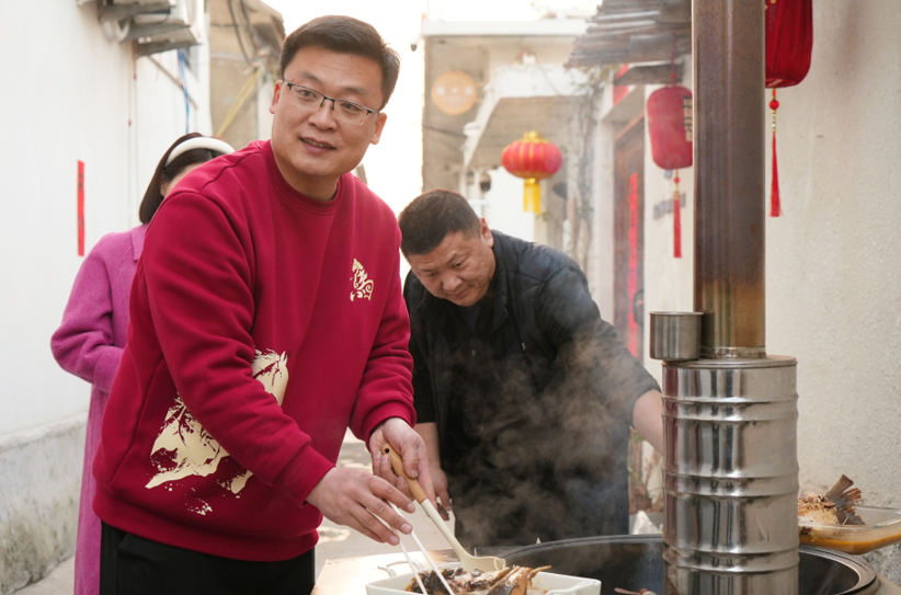 厨房里更是一派热火朝天——熬大鱼、炖猪头的香气弥漫整个小院,这是日照人过年最地道的味道。“日照过年有讲究,炖上一锅猪头肉,来年日子红红火火;年夜饭上必有大鱼,寓意年年有余。”成兵一边翻炒着锅里的菜肴,一边向游客们讲解着日照年俗。
