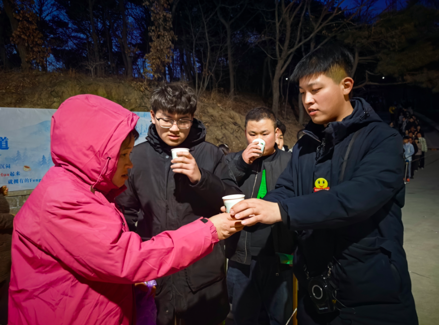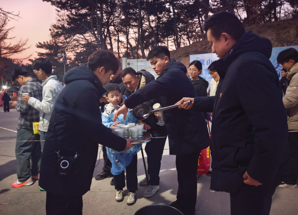 在做好入园管控的同时,沂蒙山龟蒙景区也用心服务好每一位已园游客。2月19日傍晚,气温骤降,景区内仍有大量游客排队等候乘坐观光车或选择步行下山。景区迅速启动暖心服务机制,在下山主要路口和索道站等重点区域增设御寒服务点,为游客免费提供热姜茶、热鸡蛋、一次性雨衣等御寒物资,并在排队区域安排NPC演员与游客互动,缓解疲劳,温暖下山路。