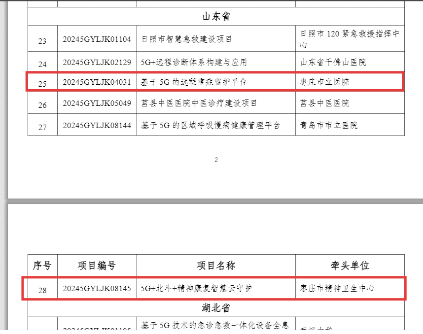 近日,工业和信息化部办公厅、国家卫生健康委员会办公厅公布了5G+医疗健康应用试点项目2025年度通过验收名单,枣庄市立医院“基于5G的远程重症监护平合”、枣庄市精神卫生中心“5G+北斗+精神康复智慧云守护”位列其中。